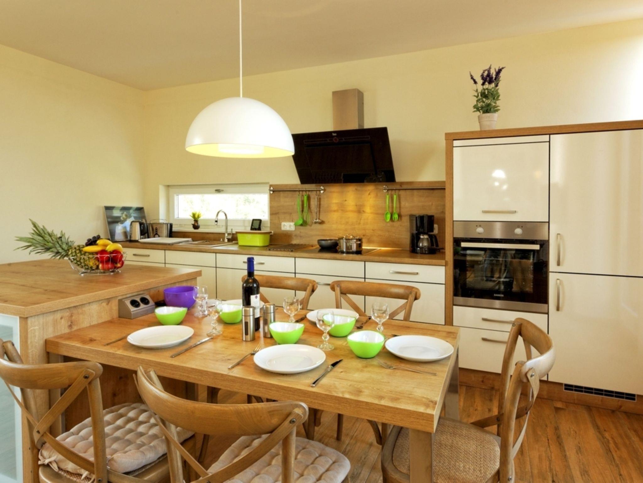 • Integrierte Küche mit Dunstabzugshaube, Geschirrspüler, Elektroherd mit Ceranfeld, Backofen, Mikrowelle, Kaffeemaschine, Toaster, Wasserkocher, Kühlschrank mit Gefrierfach