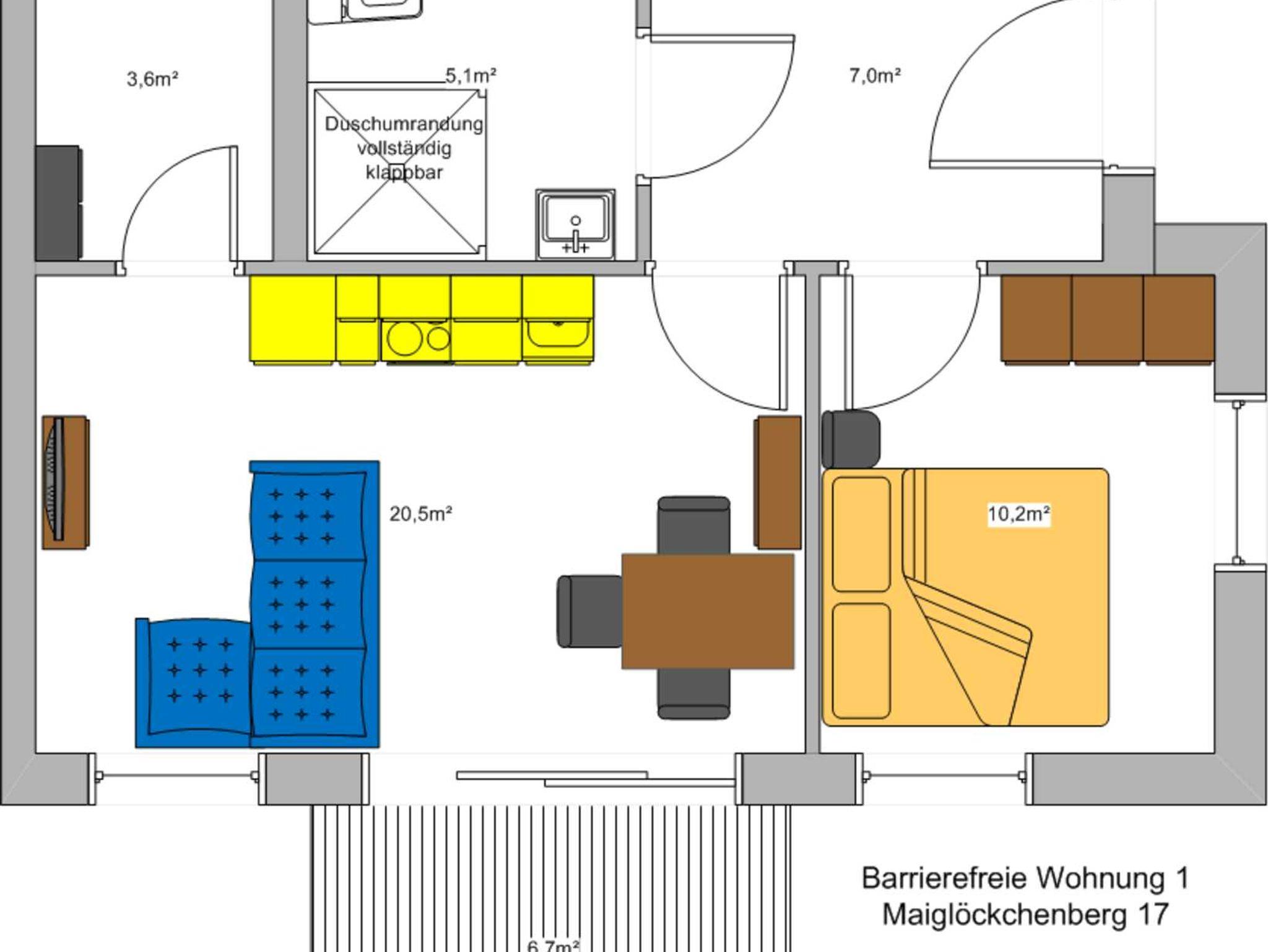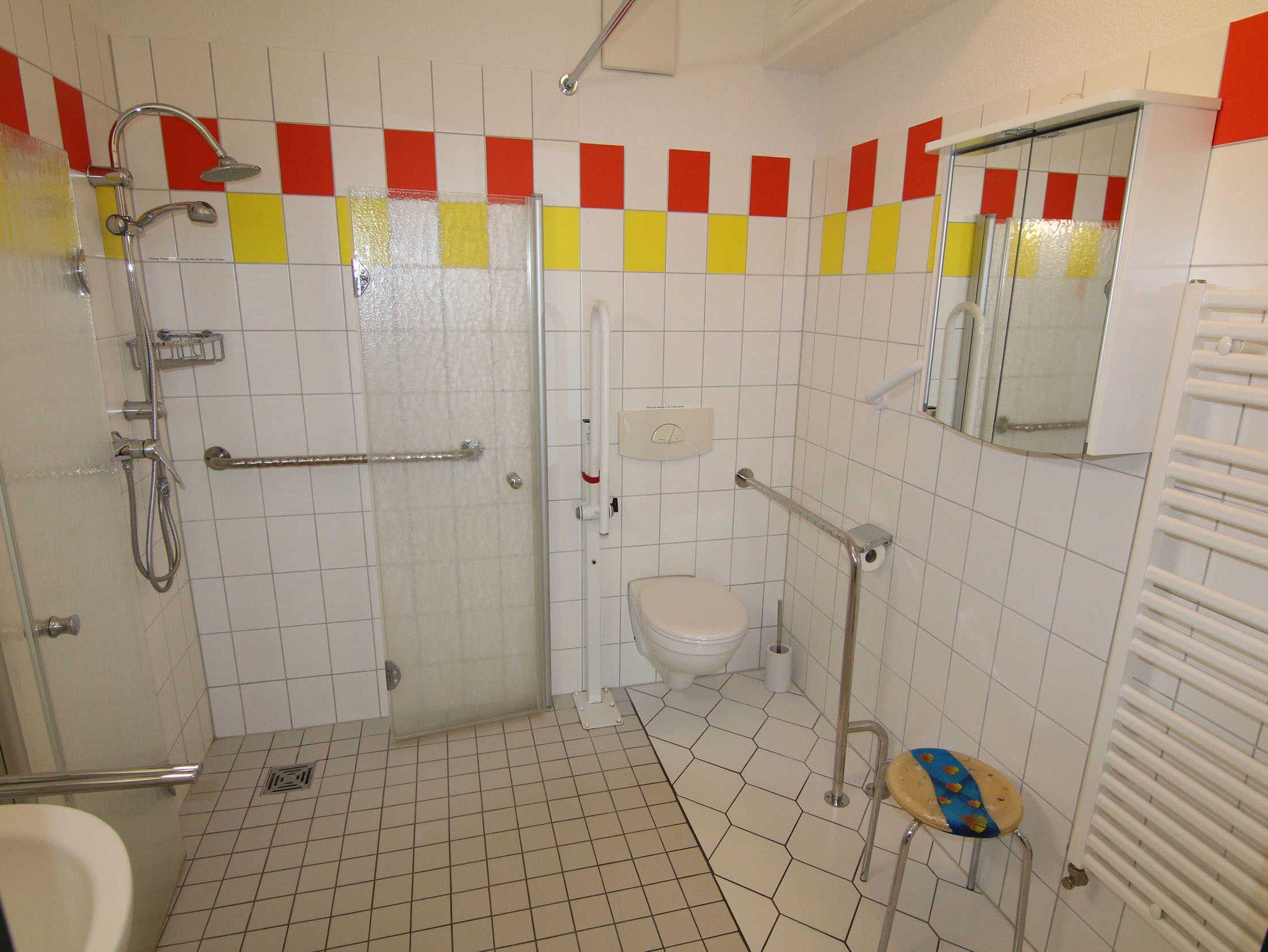 Die Wohnung ist ebenerdig, und behindertenfreunlich ausgestattet (siehe Bilder), jedoch ist der Zugang vom Wohnzimmer zur Terrasse, nicht behindertengerecht, da eine Stufe vorhanden ist. Es ist allerdings eine Rampe vorhanden.