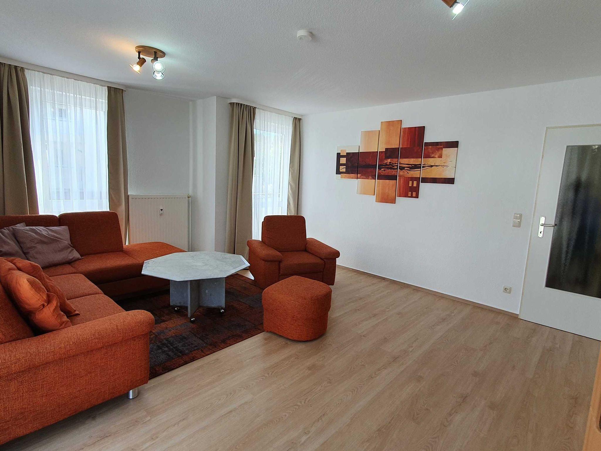 Die Wohnung hat einen großen Balkon. Auf dem Balkon sind Sitzmöbel und Tisch vorhanden.