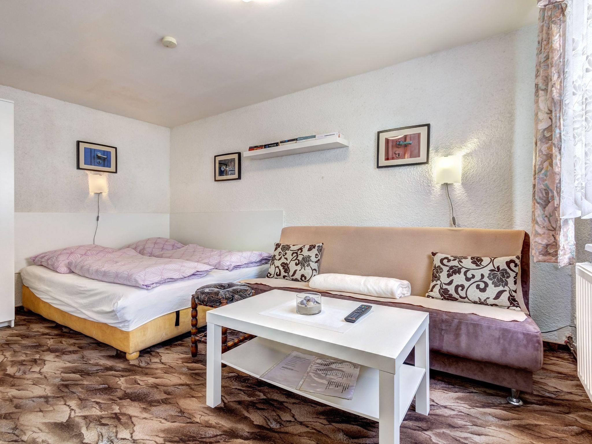 Der Bungalow überzeugt durch eine durchdachte Aufteilung: Das kombinierte Wohn- und Schlafzimmer ist gemütlich eingerichtet und bietet ein bequemes Doppelbett sowie eine zusätzliche Liege für entspannte Momente. Ein Schwingstuhl lädt zum Schmökern oder gemütlichen Verweilen ein, während ein Röhrenfernseher für die nötige Unterhaltung sorgt.