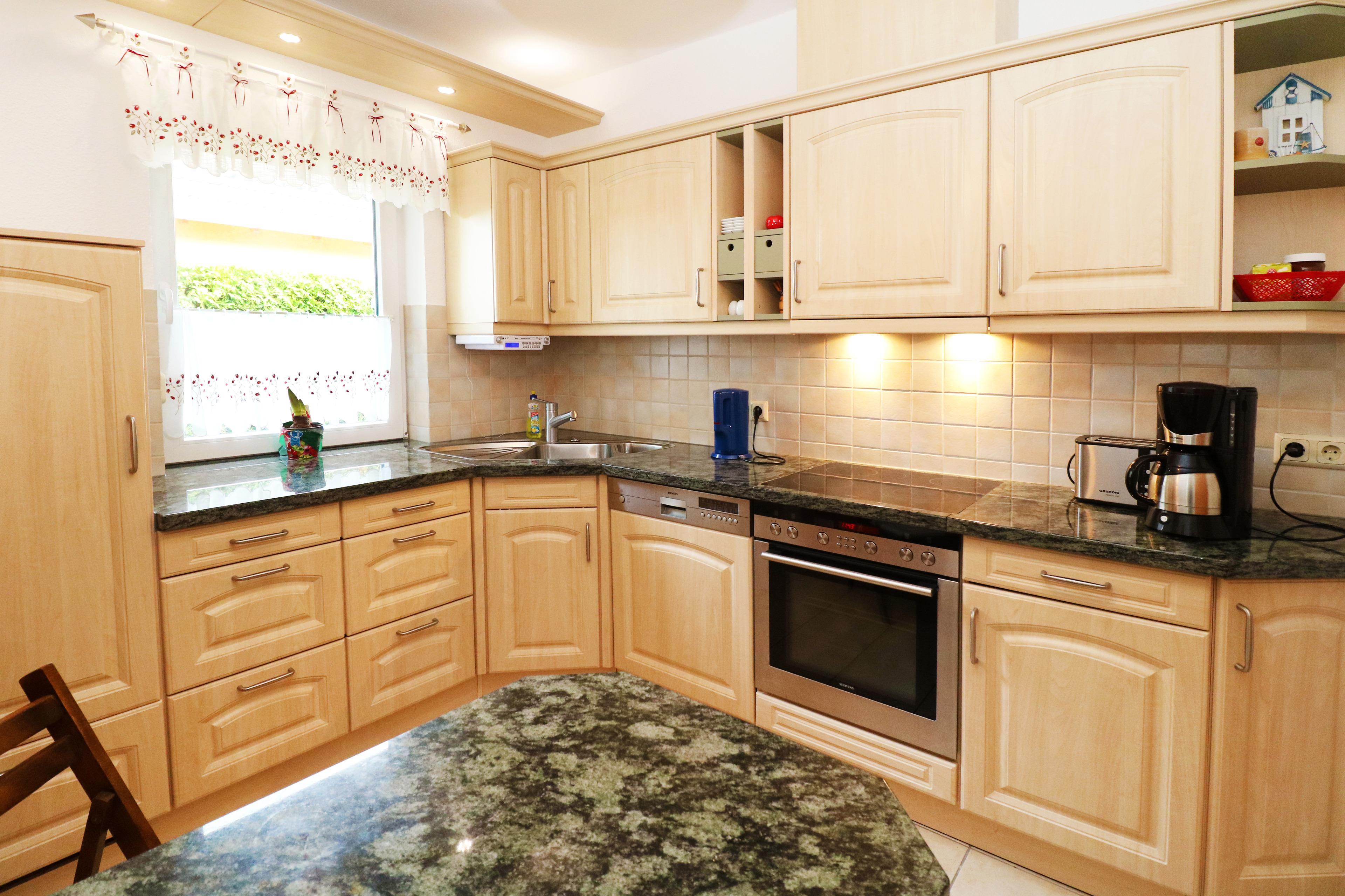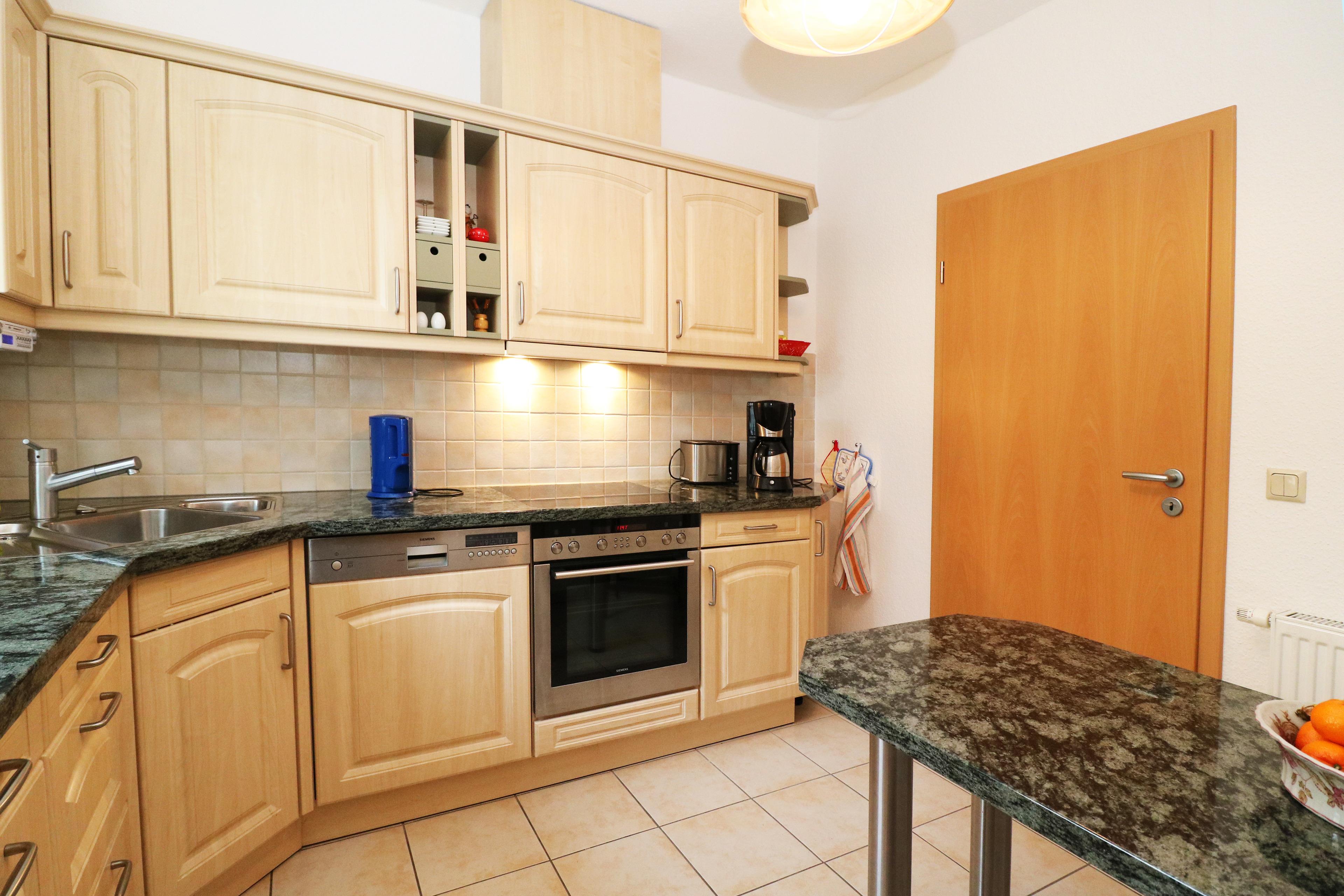 - Backofen, Spülmaschine, Kühlschrank mit Gefrierfach, 4er-Cerankochfeld, Wasserkocher, Toaster und Kaffeemaschine