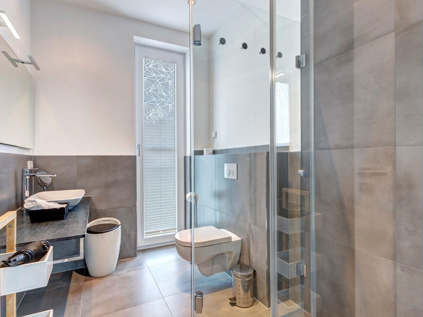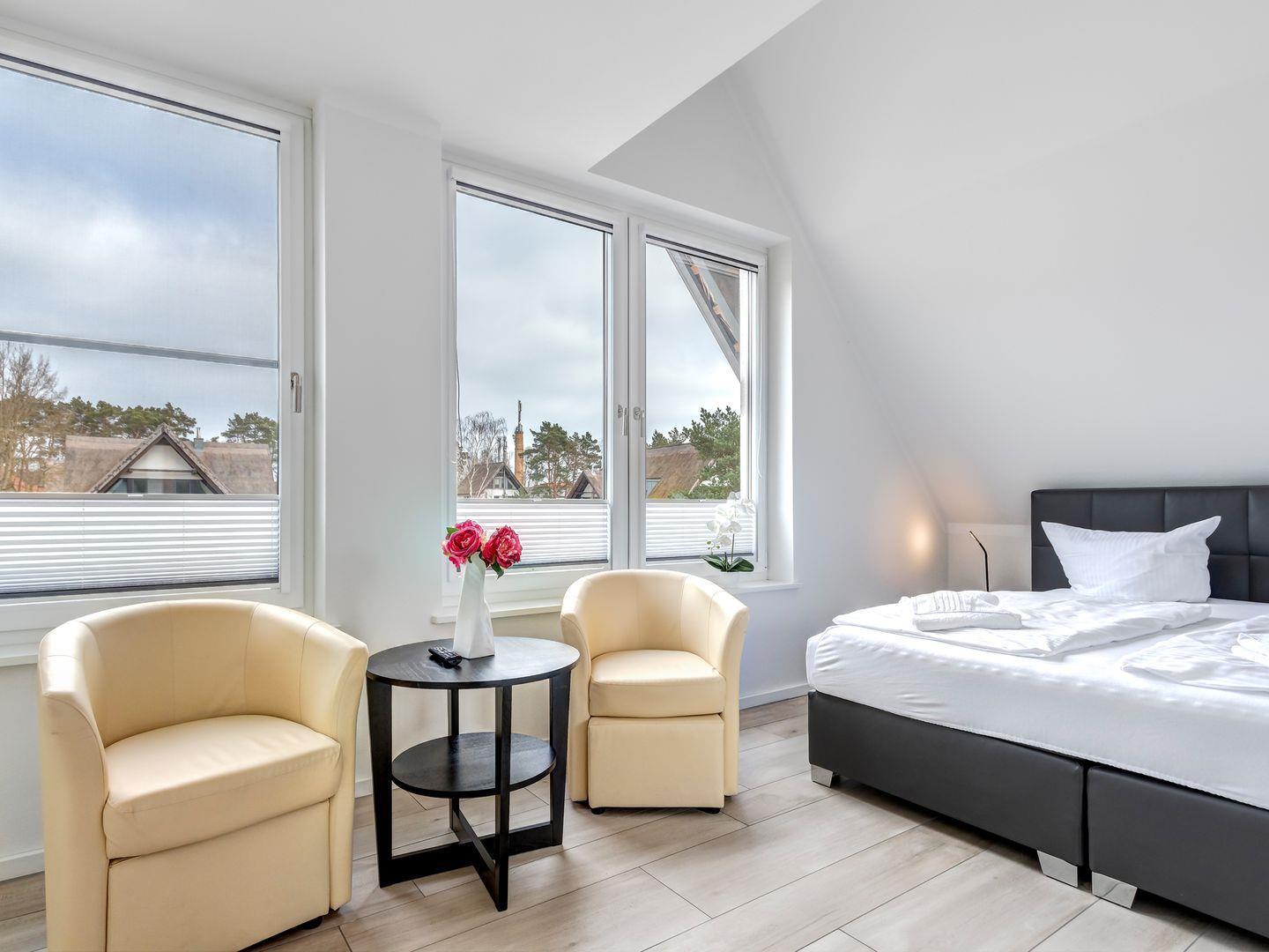 Unser Appartement "ROSA" im Obergeschoss umfasst 150 m² Wohnfläche und bietet drei Schlafzimmer mit modernster Unterhaltungstechnik und exquisiten Boxspringbetten, zwei Bäder, einen Wohn- und Küchenbereich mit Kamin sowie einen Wellnessbereich mit Sauna zur Eigennutzung. Ideal für Familien und Reisegruppen von bis zu 6 Personen. Von der Terrasse im Obergeschoss aus genießen Sie einen herrlichen Ausblick auf die umliegende Natur und können bei einem abendlichen Glas Wein die würzige Ostseeluft genießen.