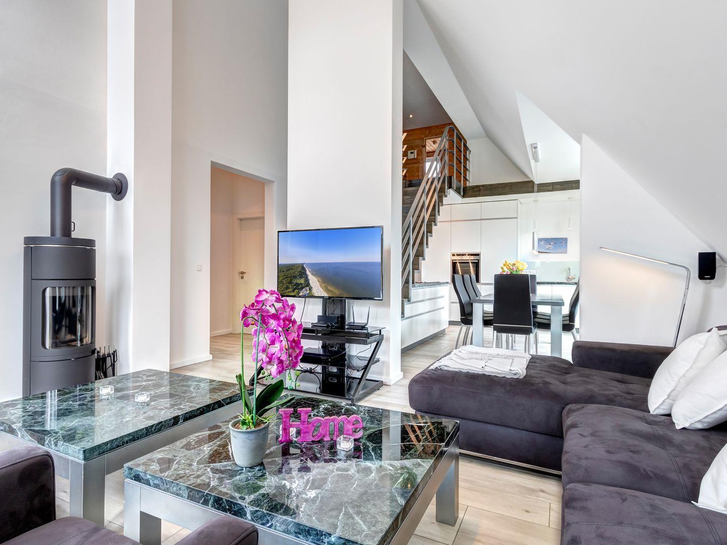 Ideal für Familien und Reisegruppen von bis zu 6 Personen. Von der Terrasse im Obergeschoss aus genießen Sie einen herrlichen Ausblick auf die umliegende Natur und können bei einem abendlichen Glas Wein die würzige Ostseeluft genießen.