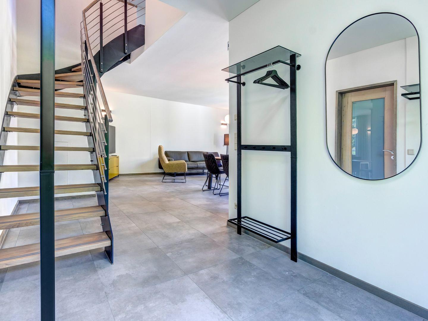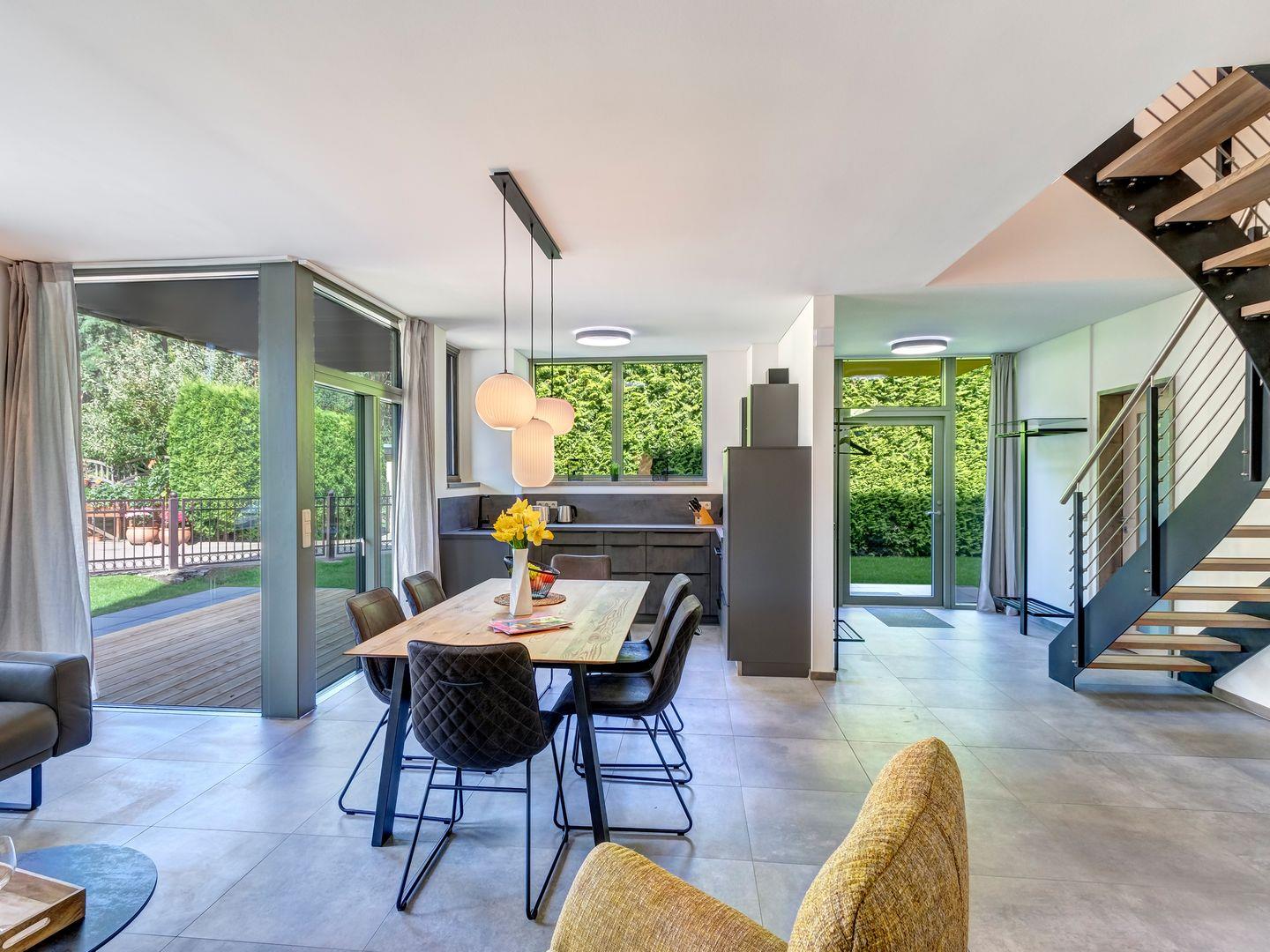 Im Erdgeschoss erwartet Sie ein großer offener Raum mit einer komplett ausgestatteten Küche inklusive Essplatz und einem Wohnzimmer mit einem beeindruckenden Smart TV. Bodentiefe Fenster sorgen für ausreichend Licht und bieten einen malerischen Blick auf den Garten und den angrenzenden Wald. Ein Gästebad mit moderner Dusche komplettiert das Angebot im Erdgeschoss.