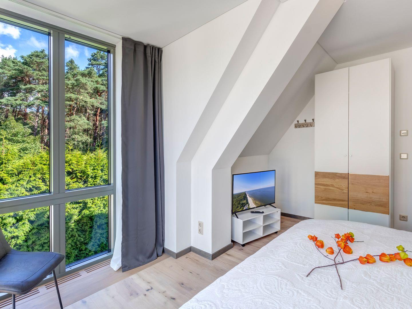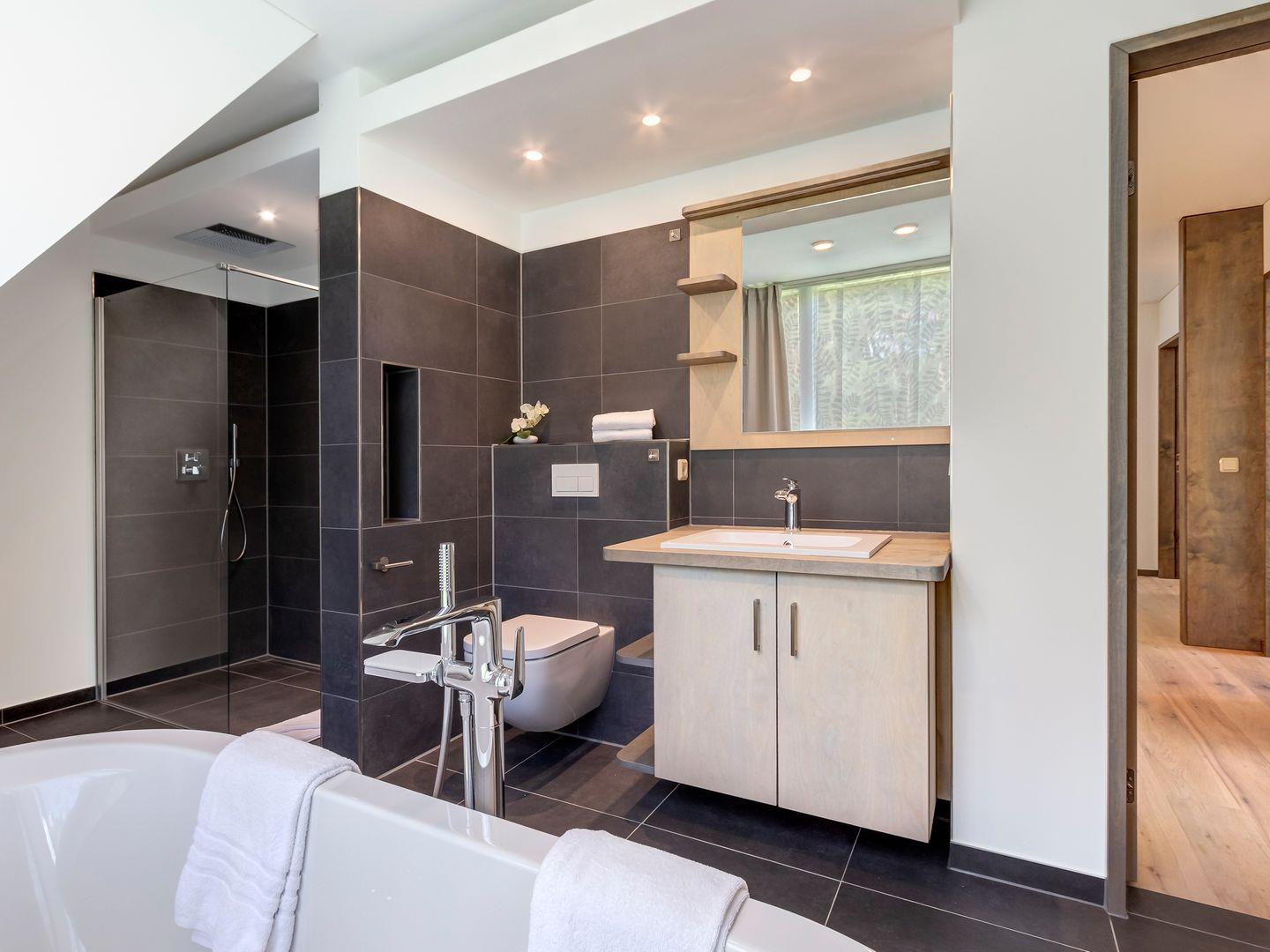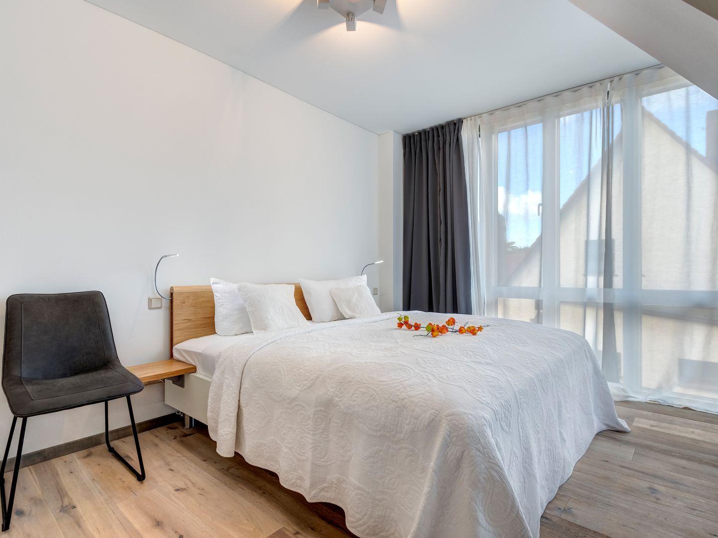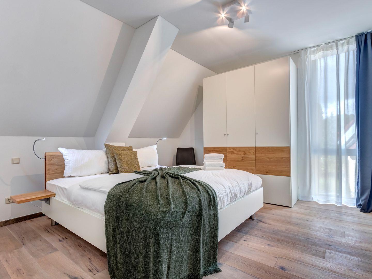 Im 1. Obergeschoss stehen Ihnen drei hochwertig eingerichtete Schlafzimmer mit jeweils einem Doppelbett zur Verfügung. Das große, lichtdurchflutete Erkerschlafzimmer mit seiner Fensterfront ist dabei besonders hervorzuheben. Zwei der Schlafzimmer sind zudem mit einem eigenen TV ausgestattet. Das "Familienbad" im 1. Obergeschoss bietet eine freistehende Badewanne und eine ebenerdige begehbare Dusche für entspannte Momente.