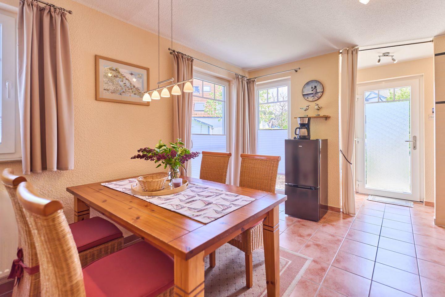 Die geschlossene Küche ist komplett ausgestattet und lässt keine Wünsche offen. Neben einem Herd mit Ceran-Kochfeld und einem Elektro-Backofen erwarten Sie eine Spülmaschine, ein Kühlschrank, eine Kaffeemaschine sowie zahlreiche Küchenutensilien, die das Kochen zum Vergnügen machen. Genießen Sie Ihre selbst zubereiteten Mahlzeiten in dem hellen Essbereich oder auf der überdachten Terrasse, die mit Gartenmöbeln und einem Grill ausgestattet ist – ideal für gesellige Abende im Freien!