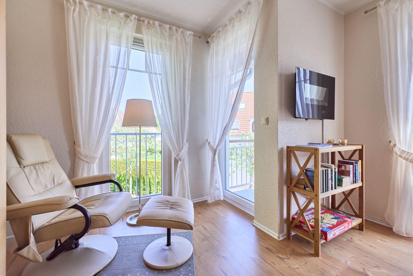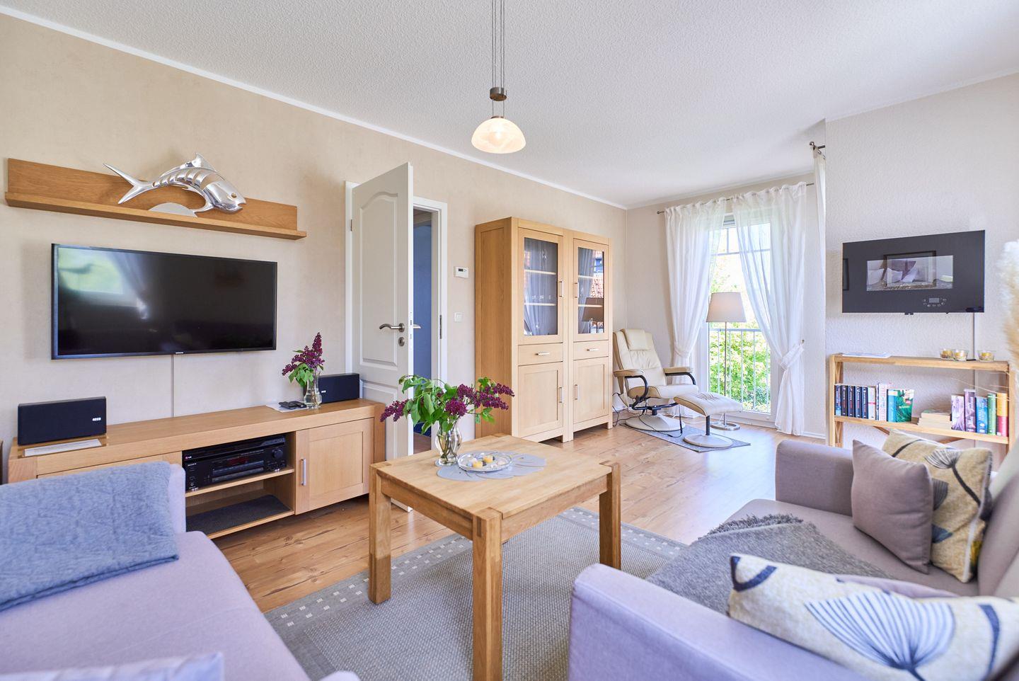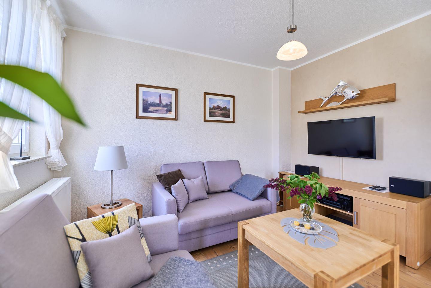 Die Ferienwohnung verfügt über ein stilvolles Schlafzimmer mit einem komfortablen Bett und einem harmonischen Laminatboden, der für eine einladende Atmosphäre sorgt. Das helle Wohnzimmer ist der perfekte Ort, um nach einem erlebnisreichen Tag zur Ruhe zu kommen. Hier finden Sie eine gemütliche Sofaecke, einen Esstisch für romantische Abendessen und einen Fernseher mit Kabelanschluss sowie einen DVD-Spieler. Für gemütliche Abende stehen Ihnen diverse Bücher, Spiele und eine HiFi-Anlage zur Verfügung.