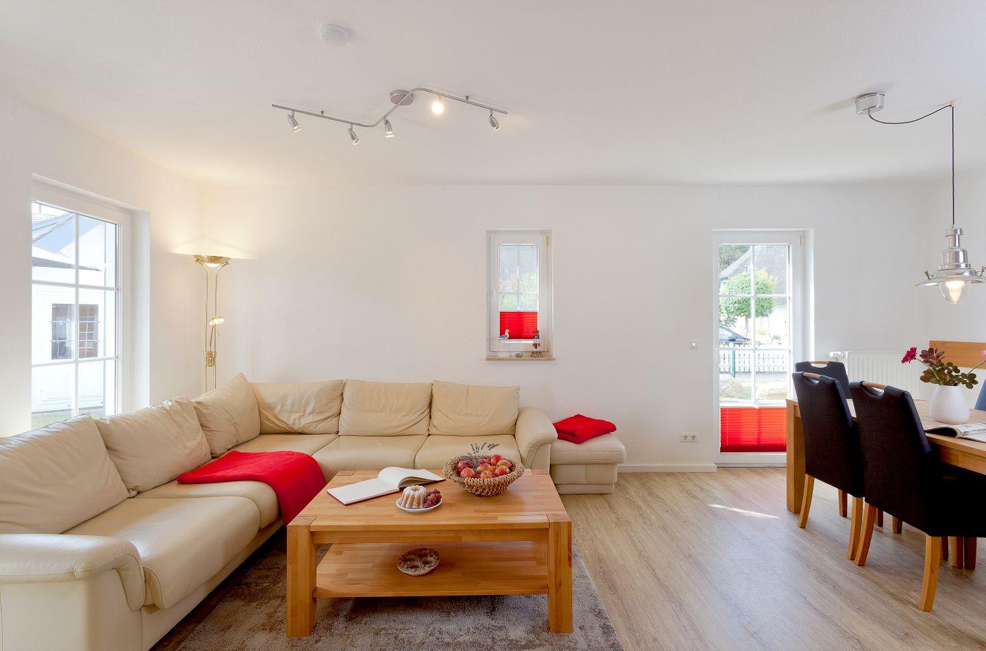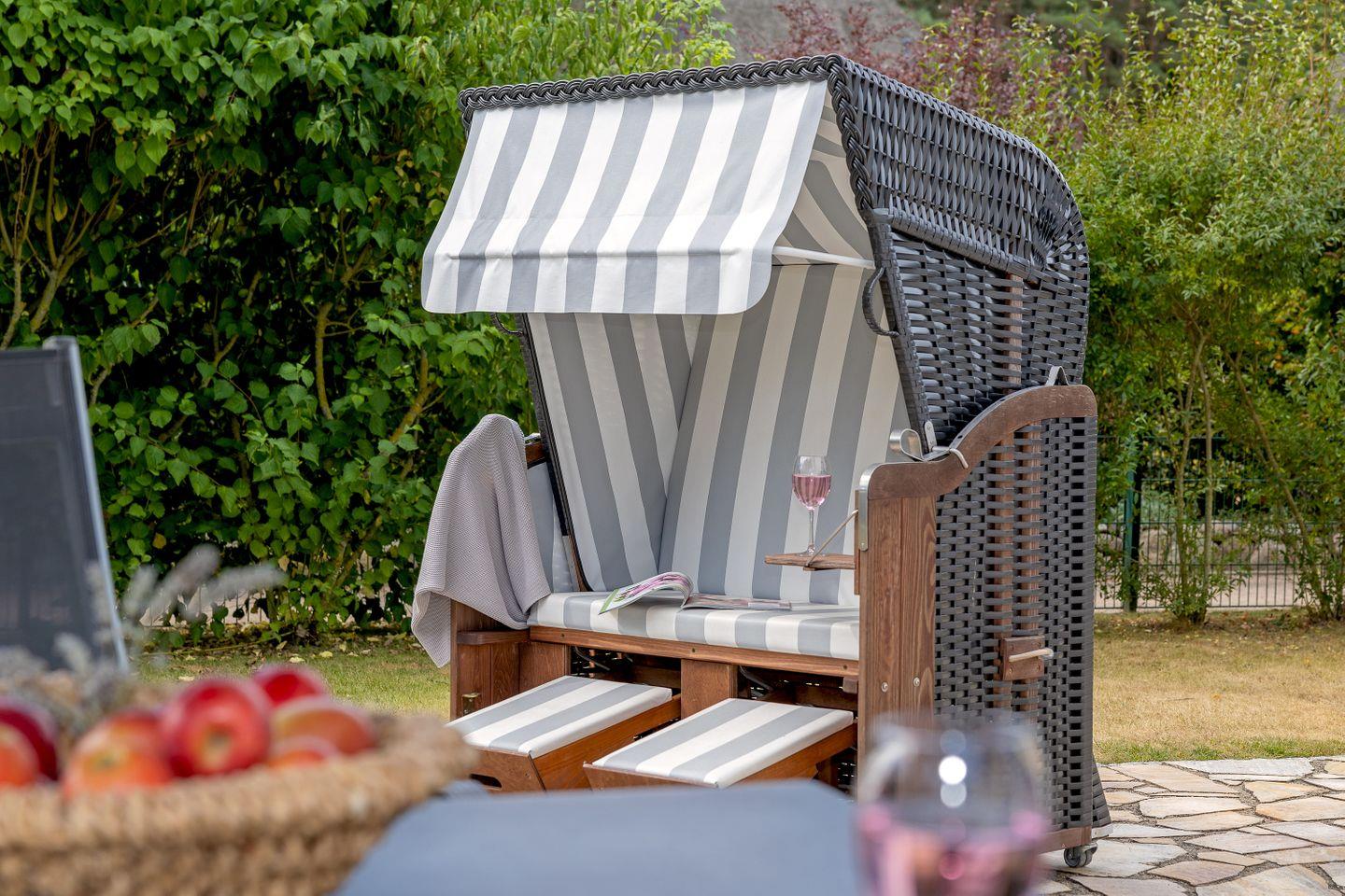 Die großen Fenster und die angenehme Fußbodenheizung schaffen eine einladende Atmosphäre und sorgen dafür, dass Sie sich sofort wie zu Hause fühlen. Durch die Markise und den Sonnenschirm auf der Terrasse können Sie die sonnigen Tage in vollen Zügen genießen. Hier ist der ideale Ort, um mit einem guten Buch oder bei einer Tasse Kaffee zu entspannen. Der abgeschlossene Gartenbereich mit Strandkorb ( April bis Oktober) bietet zudem viel Platz für Kinder zum Spielen und Toben.