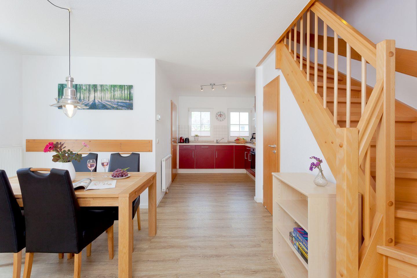 Das Ferienhaus ist über zwei Etagen verteilt und umfasst zwei gemütliche Schlafzimmer, die mit bequemen Betten und ausreichend Stauraum ausgestattet sind. Der offene Wohnbereich lädt dazu ein, gemeinsam Zeit zu verbringen, sei es beim Essen am großen Esstisch oder beim Entspannen auf der gemütlichen Sofalandschaft. Hier finden Sie auch einen Flat-Screen-TV, einen Blu-ray-Spieler und eine HiFi-Anlage, sodass Sie auch abends für Unterhaltung sorgen können.