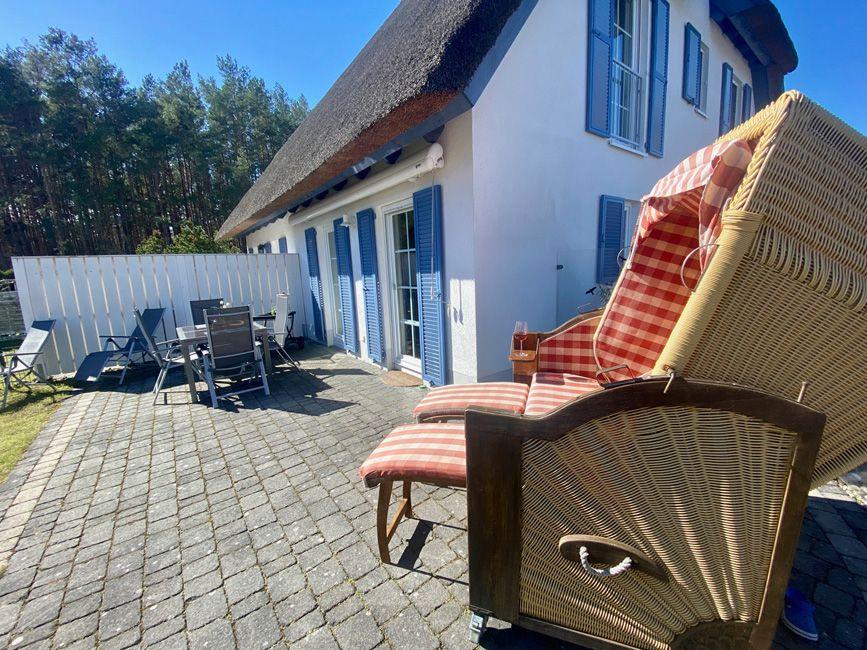 Ein weiteres Plus ist die großzügige Terrasse, auf der Sie an warmen Tagen entspannen und die Sonne genießen können. Gartenmöbel, Strandkorb und Liegen stehen Ihnen zur Verfügung, damit Sie bequem die frische Luft und die Umgebung genießen können. Für den Grillabend im Freien gibt es zudem einen Kohlegrill. Der große Garten mit Sichtschutz sorgt dafür, dass Sie ungestört entspannen können.