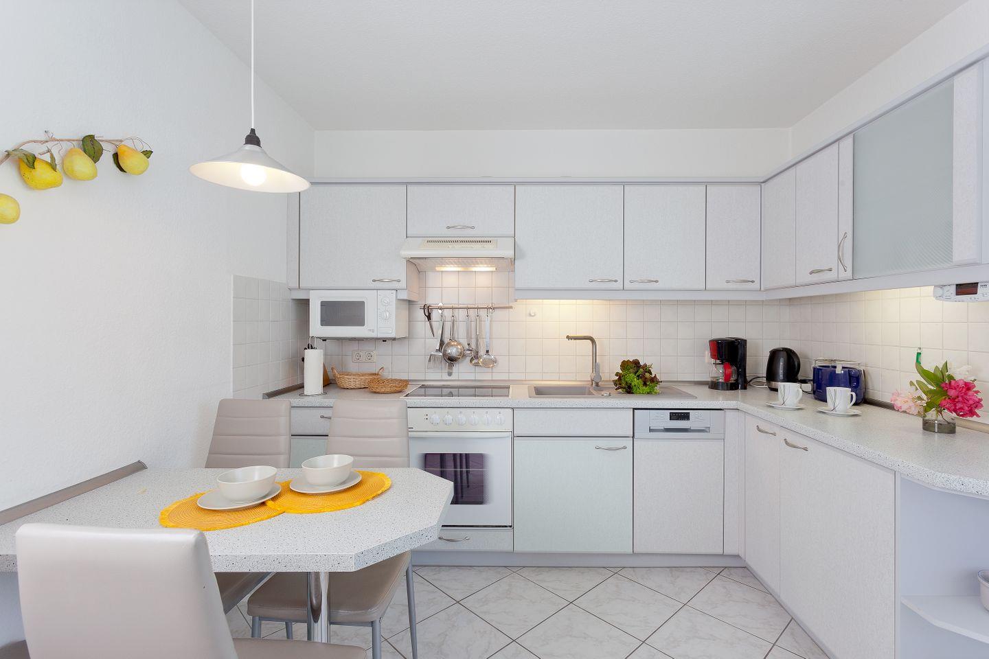 Die geschlossene Küche ist mit allem ausgestattet, was Sie benötigen: einer Ceran-Kochplatte, einem Backofen, einer Mikrowelle, einem Kühlschrank mit Gefrierfach sowie einer Spülmaschine und einem Toaster. Der Esstisch bietet ausreichend Platz für gemeinsame Mahlzeiten oder Spieleabende.
