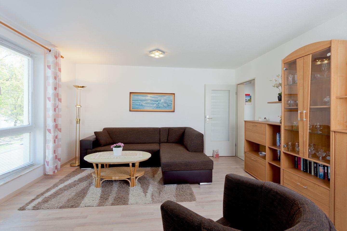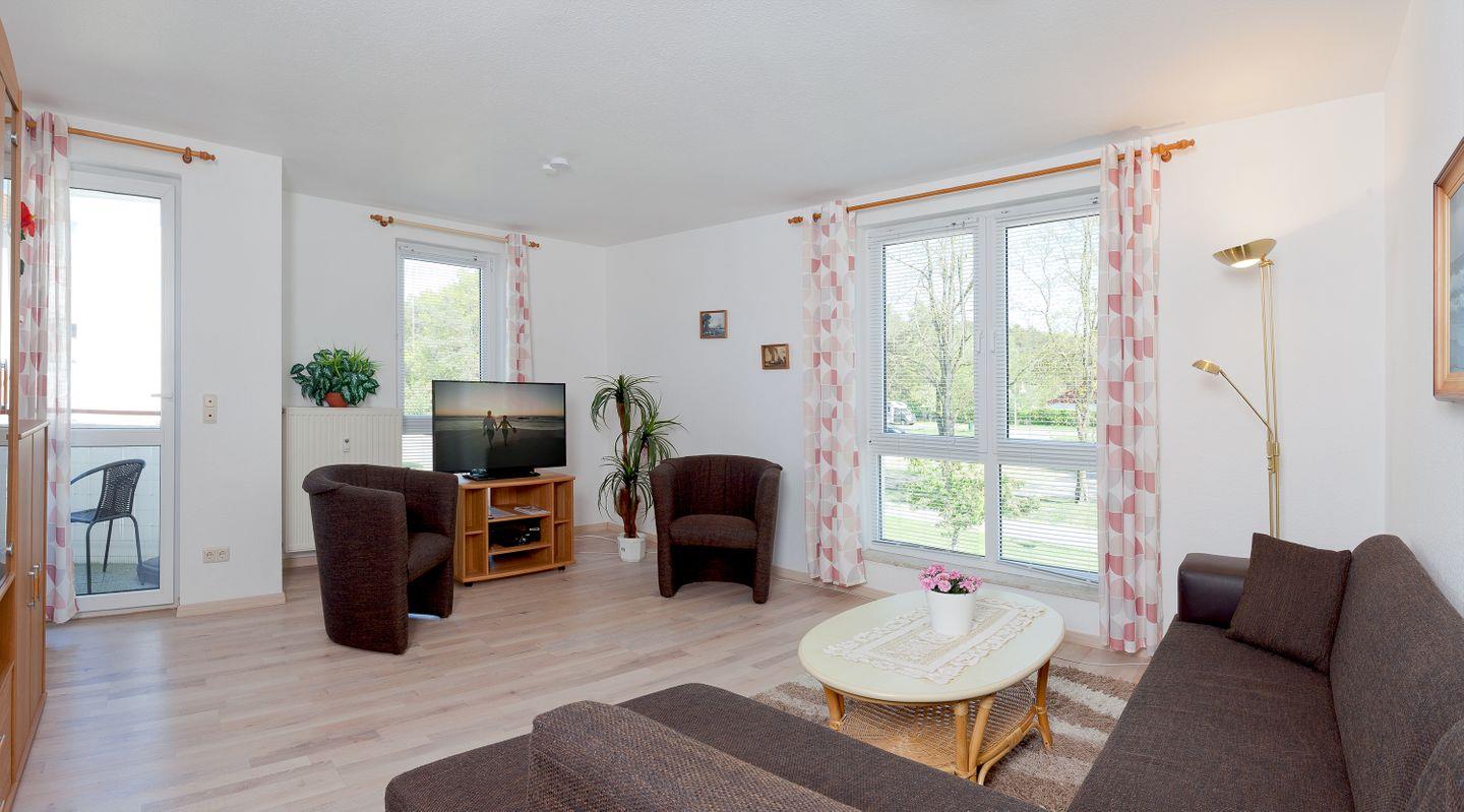 Die Ferienwohnung bietet auf 63 m² ausreichend Platz für bis zu drei Personen, ideal für Paare oder kleine Familien. Ausgestattet mit einem freundlich gestalteten Wohnzimmer, einem komfortablen Schlafzimmer und einer modernen Küche, erfüllt diese Unterkunft alle Wünsche. Die gemütliche Sofaecke im Wohnbereich lädt zum Entspannen ein, während der große Fernseher mit Satellitenanschluss ideal für einen Filmabend ist. Zusätzlich finden Sie eine Auswahl an Büchern und einen CD-Spieler, um entspannte Stunden zu verbringen.