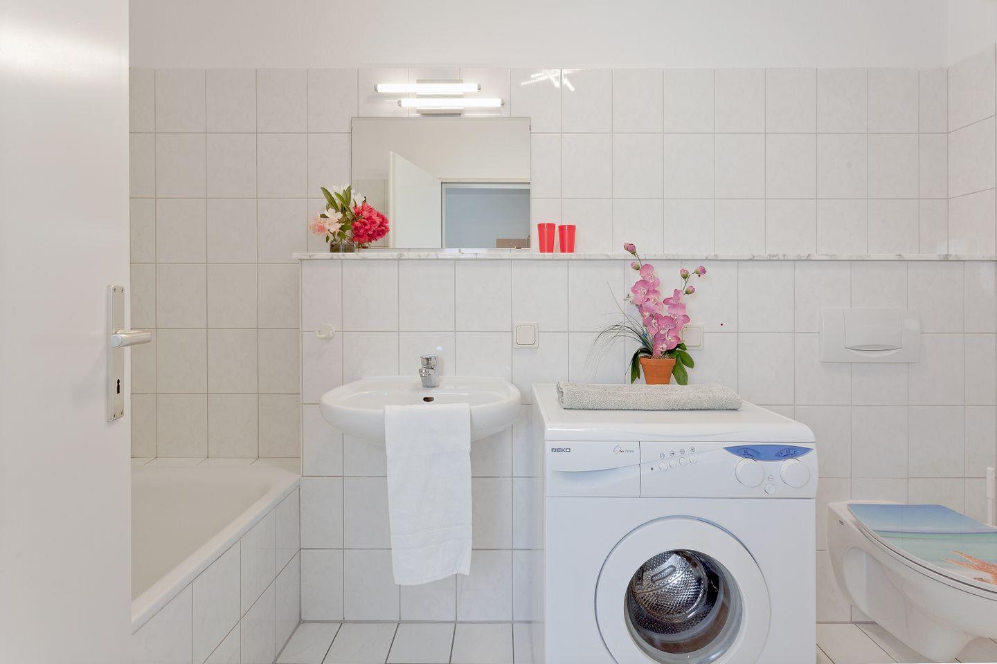 Das modern gestaltete Badezimmer überzeugt mit einer Dusche und einer Badewanne – perfekt für Ihr tägliches Verwöhnprogramm. Zudem ist die Unterkunft Allergiker geeignet und eine Nichtraucherwohnung, in der sich jeder wohlfühlen kann.