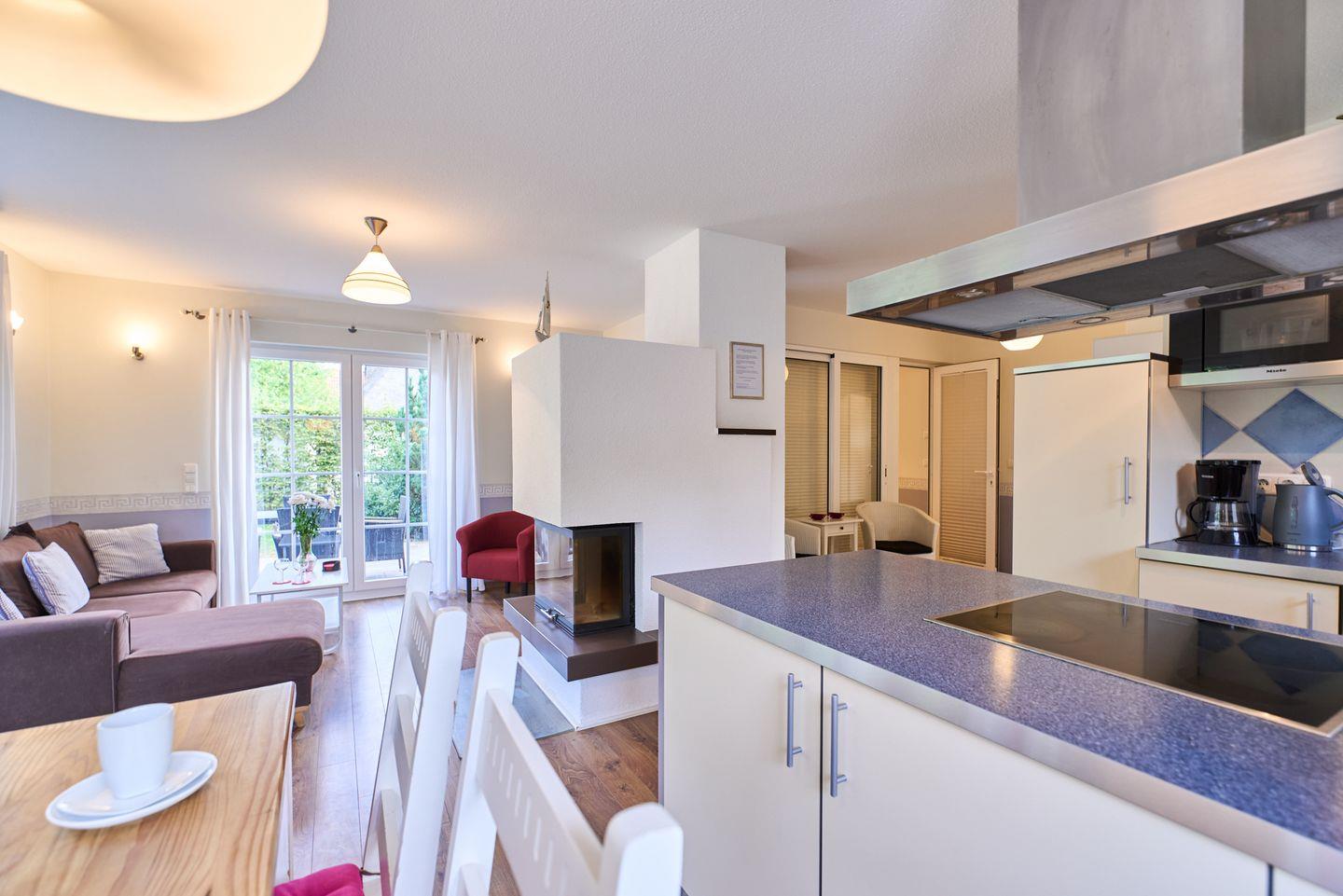 In der voll ausgestatteten Küche, die in das Wohnzimmer integriert ist, finden Sie alles, was Sie zum Zubereiten leckerer Mahlzeiten benötigen. Nutzen Sie den Ceranfeld-Herd, den Backofen oder die Spülmaschine, um Ihren Aufenthalt so angenehm wie möglich zu gestalten. Ein Essbereich mit einem großen Tisch bietet ausreichend Platz für gemeinsame Mahlzeiten und gesellige Abende.
