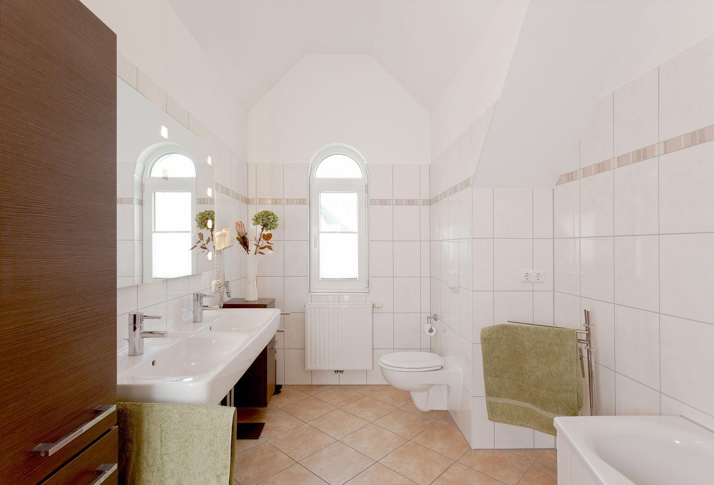 Abgerundet wird Ihr Aufenthalt durch die praktische Ausstattung: Waschen im Waschbecken, Wohlfühlen in der Badewanne oder unter der bodengleichen Dusche – hier ist für alles gesorgt.