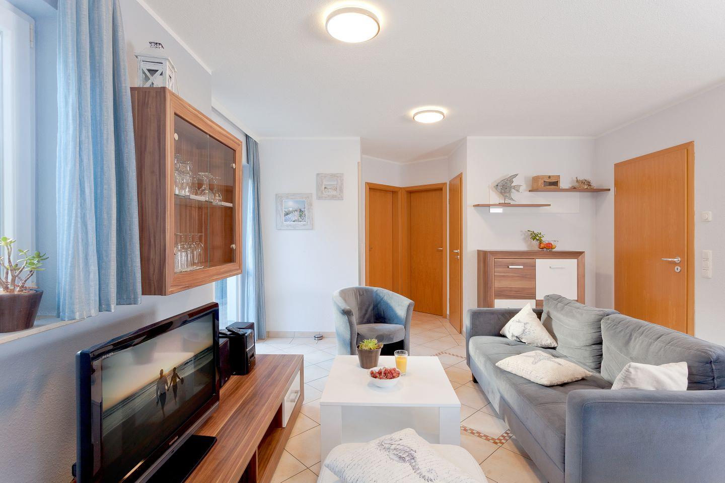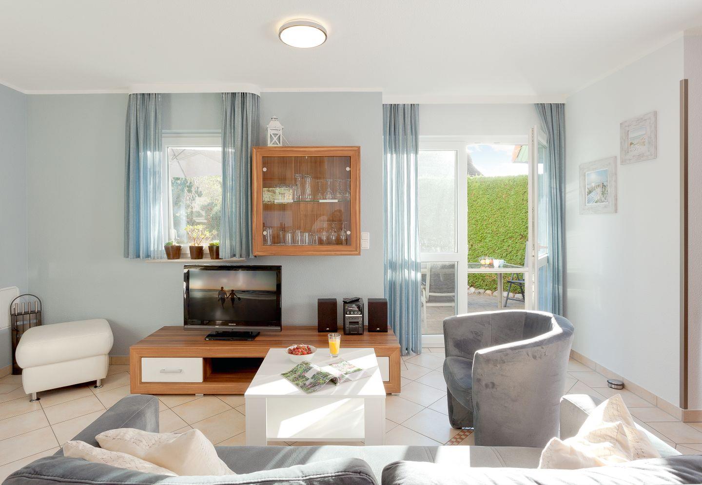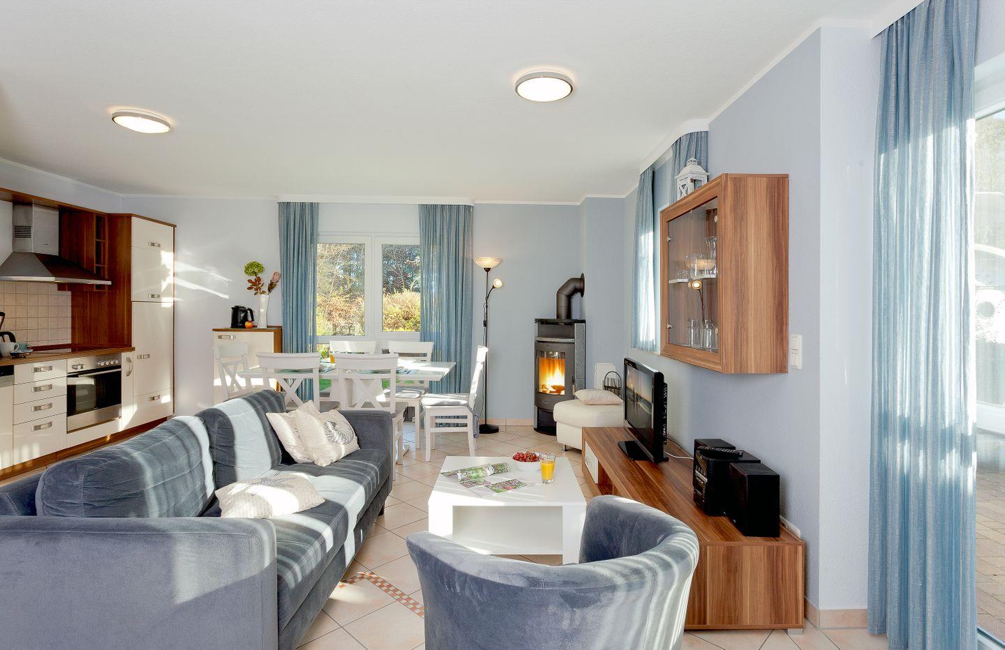 Das lichtdurchflutete Wohnzimmer, ausgestattet mit einem Kaminofen, lädt zum Verweilen ein. Hier können Sie sich entspannt zurücklehnen und die Zeit mit einem guten Buch oder in geselliger Runde genießen. Für Unterhaltung sorgen drei Fernseher und eine HiFi-Anlage, die für die passende musikalische Untermalung sorgt. Außerdem gibt es zahlreiche Spiele, die ideal für gesellige Abende sind.