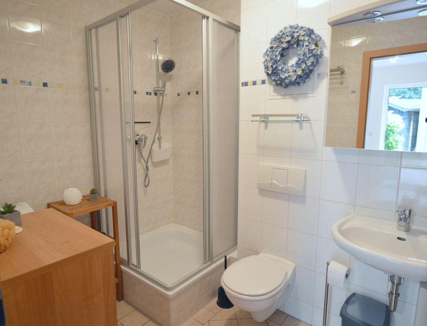 Das Bad ist mit einer Dusche ausgestattet und eignet sich ideal für erholsame Wellnessmomente nach einem aktiven Tag. Zudem stehen Ihnen die Annehmlichkeiten einer Waschmaschine, Bügeleisen und Bügelbrett zur Verfügung.