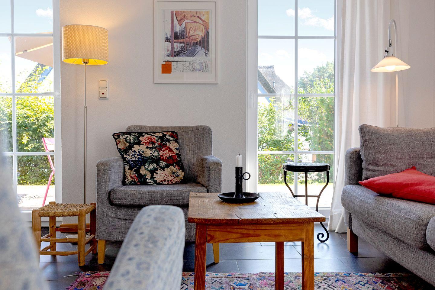 Die großzügige Ausstattung der 74 m² großen Unterkunft lässt keine Wünsche offen. Das lichtdurchflutete Wohnzimmer mit modernen Fliesenböden lädt zum Entspannen ein und ist ausgestattet mit einem gemütlichen Sofa sowie einem Esstisch für gemeinsame Essen und Spieleabende. Für Ihre Unterhaltung sorgt ein TV-Gerät und eine HiFi-Anlage – ideal für entspannte Film- oder Musikabende.