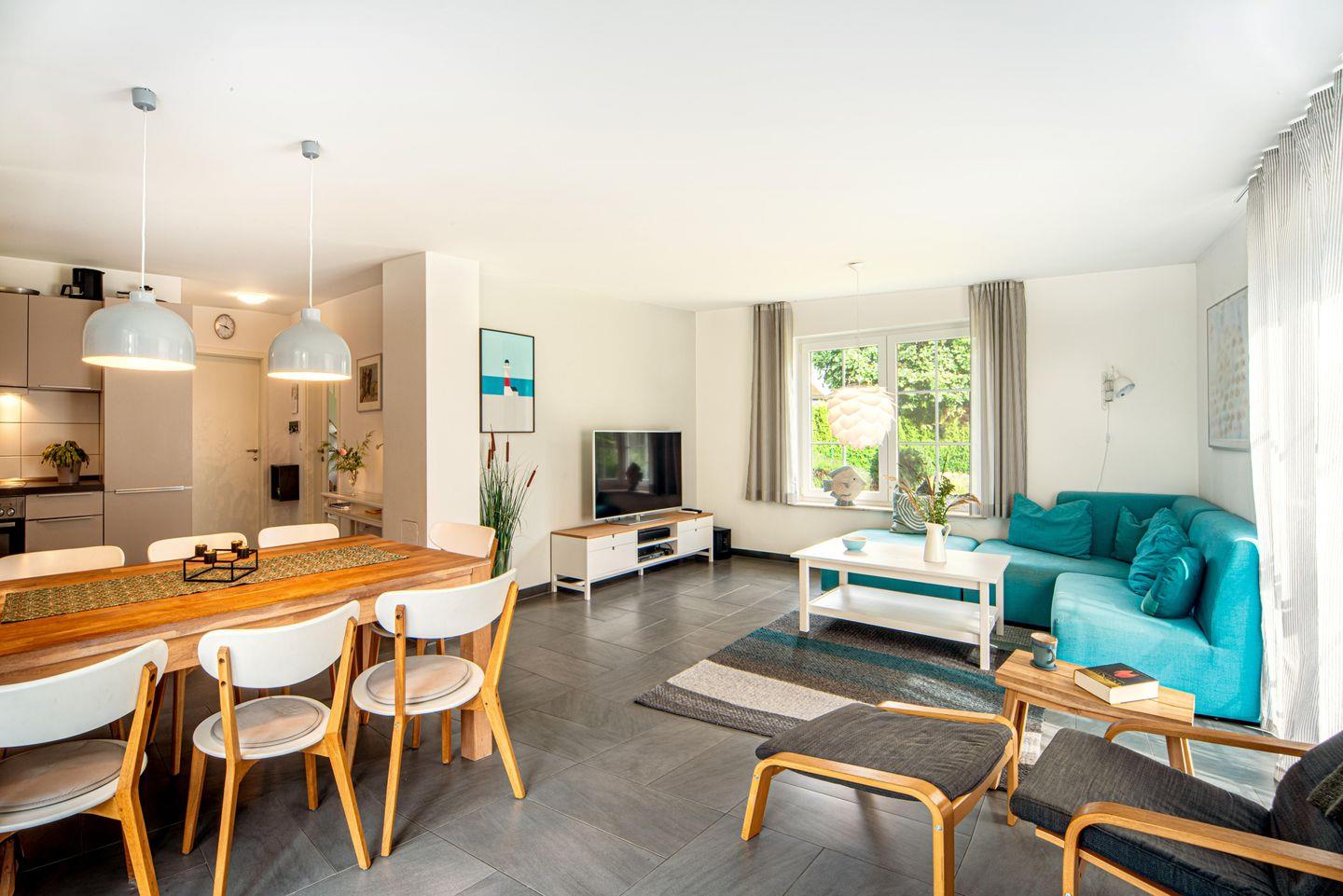 Die offene Küche ist mit modernen Geräten wie einem Kühlschrank, Geschirrspüler, Backofen und Mikrowelle ausgestattet und lädt dazu ein, kulinarische Köstlichkeiten zuzubereiten. Direkt angrenzend befindet sich der Essbereich, wo Sie in geselliger Runde zusammen essen können. Das geräumige Wohnzimmer begeistert durch eine gemütliche Sofaecke, die zum Entspannen und Verweilen einlädt. Hier können Sie an kalten Abenden vor dem TV eine filmreiche Zeit verbringen. Dank der Vielzahl an Unterhaltungsmöglichkeiten, einschließlich Blu-ray-Player, Bücher und Spiele, wird Ihnen bei jedem Wetter nie langweilig.