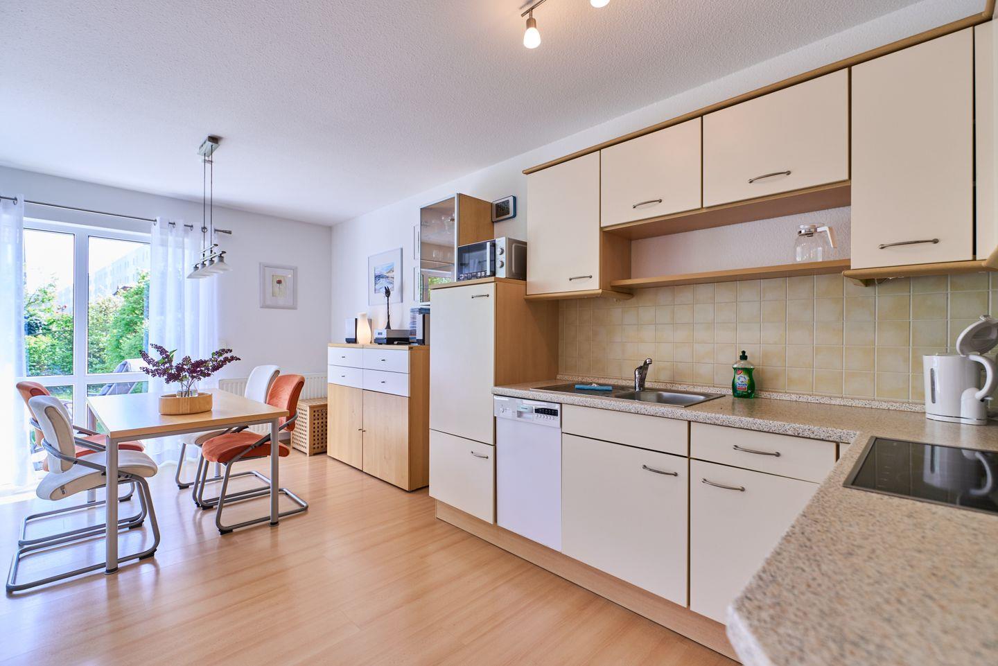 Die voll ausgestattete Küche lässt keine Wünsche offen: Hier finden Sie alle notwendigen Küchengeräte, darunter Herd, Backofen, Kühlschrank, Geschirrspüler und sogar eine Mikrowelle. Bereiten Sie köstliche Mahlzeiten zu und genießen Sie diese auf der überdachten Terrasse, die sich hervorragend für entspannte Stunden im Freien eignet. Gartenmöbel und ein Strandkorb laden dazu ein, die Seele baumeln zu lassen und die frische Seeluft zu genießen.