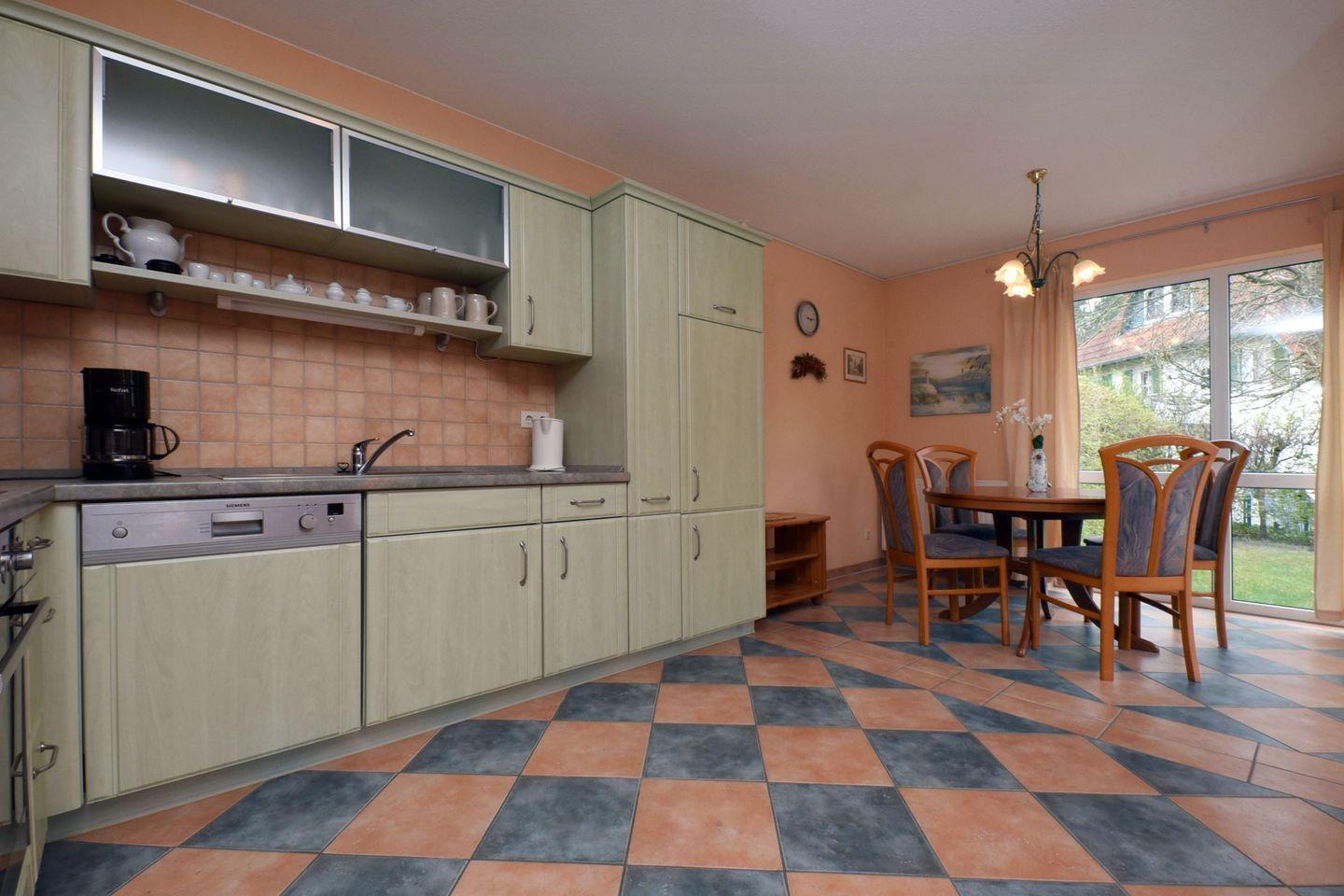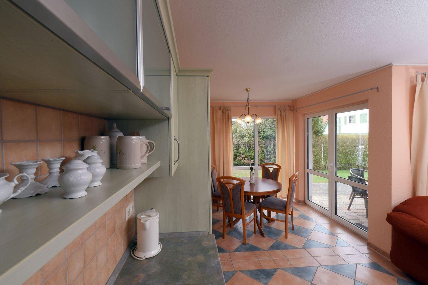 Die moderne, offene Küche ist mit hochwertigen Geräten ausgestattet, darunter ein Herd, ein Backofen, eine Spülmaschine, ein Kühlschrank mit Gefrierfach sowie eine Kaffeemaschine und ein Toaster. Hier können Sie ganz entspannt Ihre Lieblingsgerichte zubereiten, die Sie dann im ansprechenden Essbereich genießen können. Das Wohnzimmer mit gemütlicher Sofaecke lädt zum Verweilen ein, und ein Flatscreen-TV sorgt für Unterhaltung an gemütlichen Abenden. Der gesamte Wohnbereich überzeugt durch eine lichtdurchflutete Atmosphäre mit Fliesen- und Laminatböden, die zur Entspannung einladen.