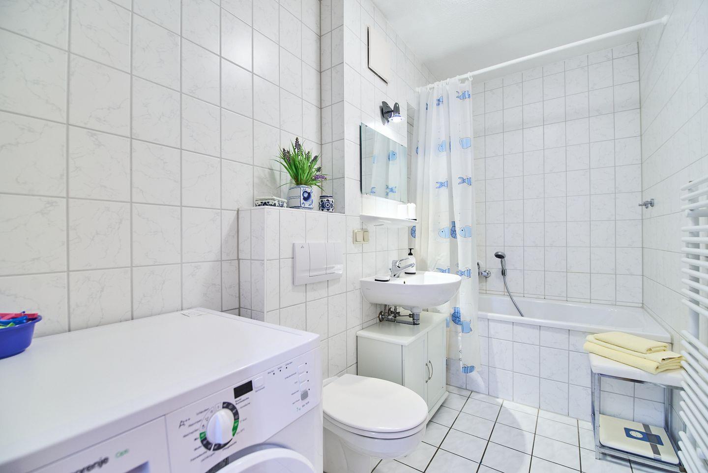 Das Schlafzimmer ist eine wahre Oase der Ruhe, ausgestattet mit einem gemütlichen Teppichboden und einem komfortablen Bett, das erholsame Nächte garantiert. Auf Wunsch können die Schlafmöglichkeiten durch ein Schlafsofa im Wohnzimmer ergänzt werden. Das moderne Badezimmer mit Badewanne und WC und einer Waschmaschine bietet Ihnen alles, um sich nach einem Aktionsreichen Tag zu entspannen.