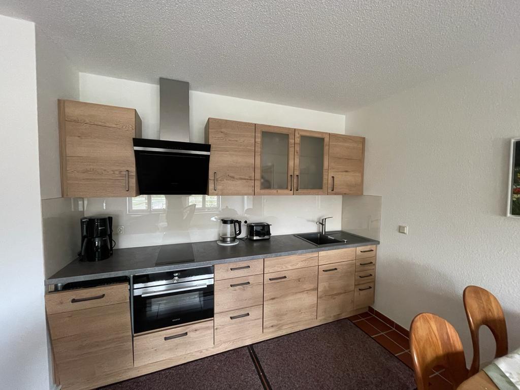 Die offene Küche präsentiert sich voll ausgestattet mit einem Herd, einem Backofen, einer Spülmaschine und weiteren modernen Annehmlichkeiten wie Mikrowelle, Kühlschrank und Kaffeemaschine. Sie müssen sich also um nichts kümmern und können sich ganz den kulinarischen Freuden widmen. Ein großer Esstisch bietet genügend Platz für gemeinsame Mahlzeiten oder gesellige Runden.