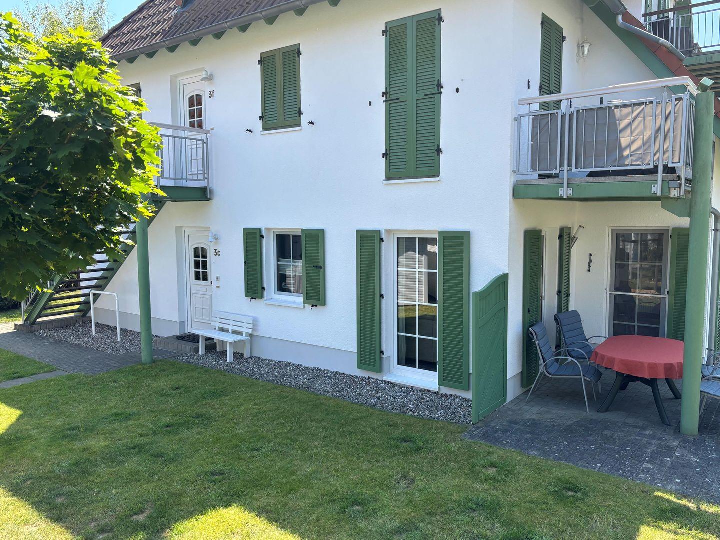 Die FeWo 43.3 verfügt über zwei komfortable Schlafzimmer, in denen erholsame Nächte garantiert sind. Das offene Wohnkonzept, das Wohn- und Essbereich vereint, schafft ein Gefühl von Weite und Freiheit. Hier können Sie am Esstisch gemeinsam essen, Spiele spielen oder einfach in der Sofaecke entspannen. Die große, überdachte Terrasse ist ein weiteres Highlight dieser Unterkunft – genießen Sie die frische Seeluft, während Sie auf den bequemen Gartenmöbeln entspannen oder ein gutes Buch lesen.