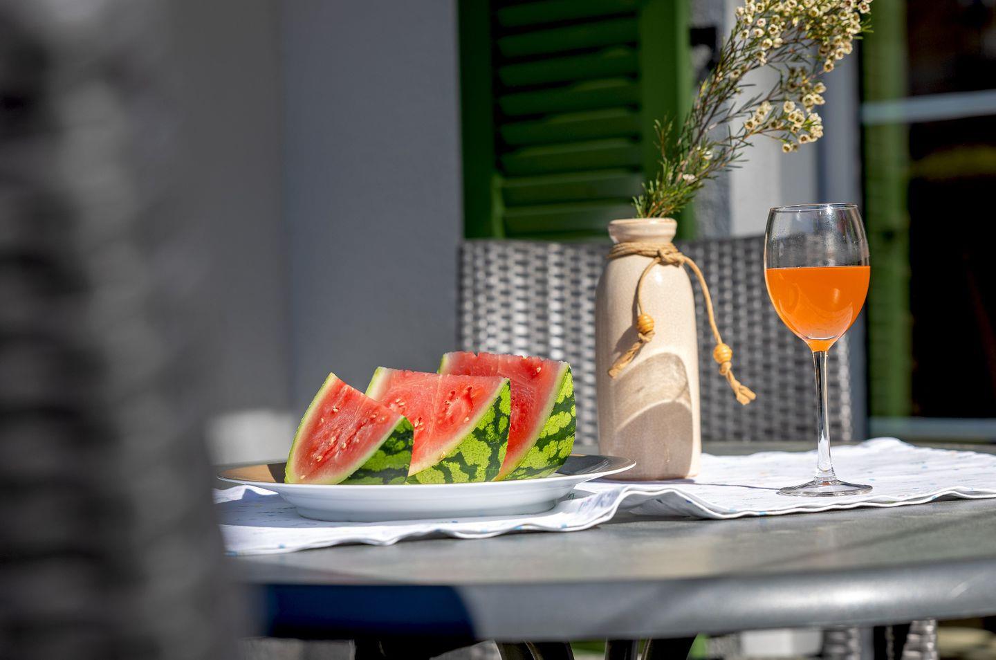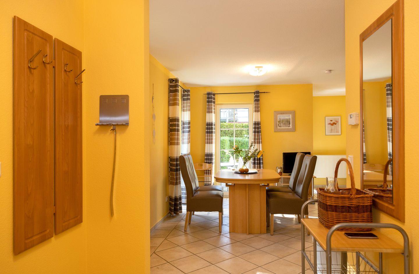 Die offene und moderne Küche ist der ideale Ort für kulinarische Entfaltungen. Sie ist mit allen wichtigen Küchenutensilien ausgestattet, darunter ein Herd mit Ceranfeld, ein Backofen, eine Spülmaschine und eine Mikrowelle, sodass Sie während Ihres Aufenthalts bequem selbst kochen können. Der angrenzende Essbereich lädt dazu ein, die zubereiteten Köstlichkeiten in geselliger Runde zu genießen. Das helle Wohnzimmer mit einer Sofaecke und einem Fernseher sorgt für entspannte Abende nach einem erlebnisreichen Tag in der Natur oder am Strand.