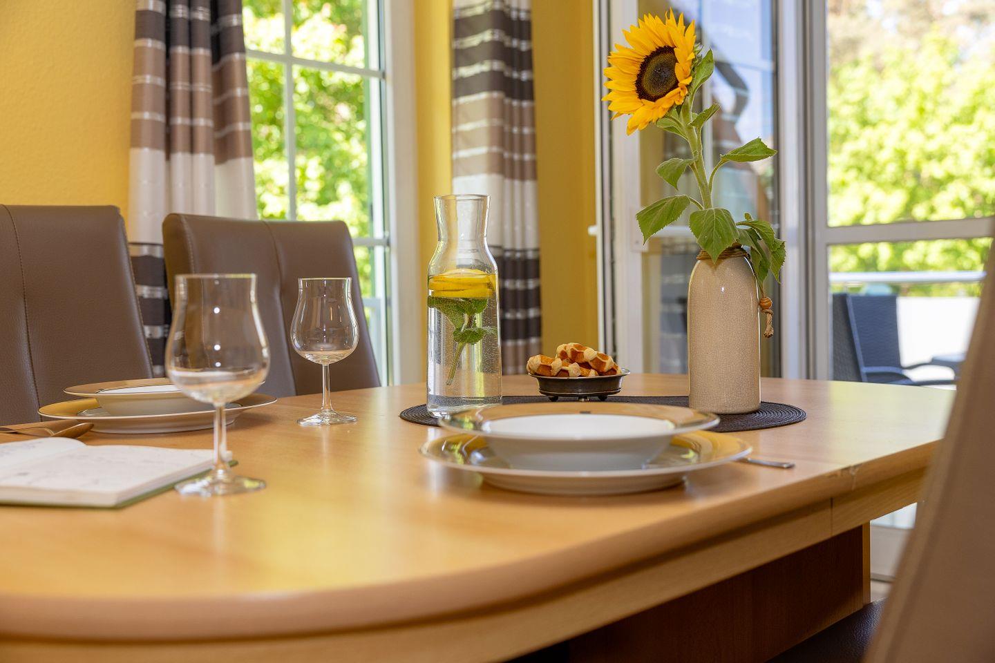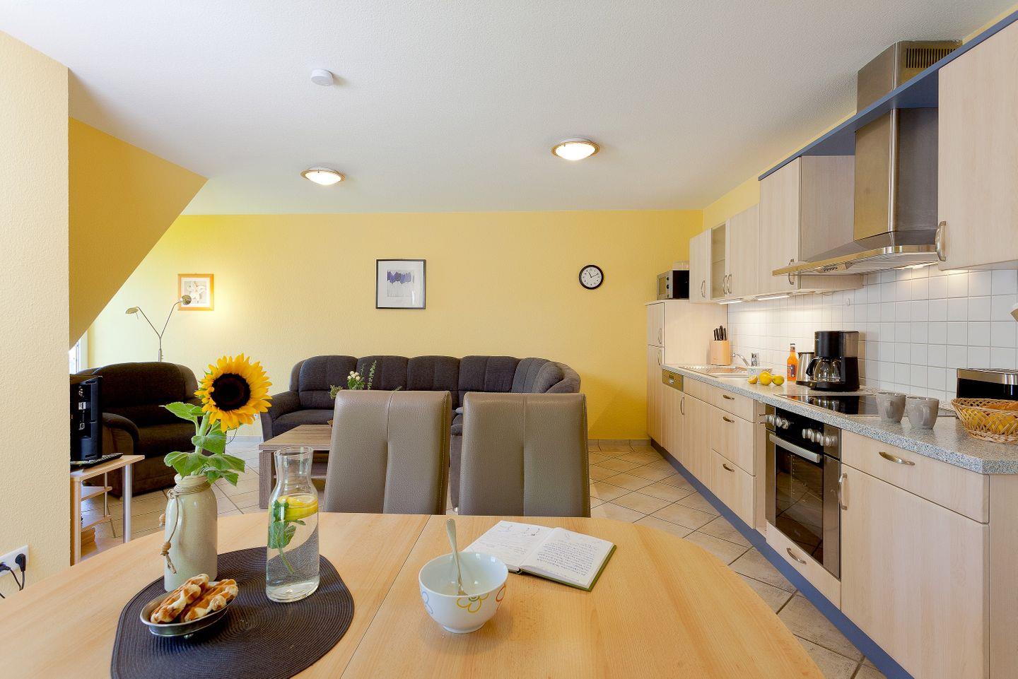 Die Ferienwohnung überzeugt mit einem einladenden und offenen Wohnbereich, der mit einer komfortablen Sofaecke, einem Esstisch und einem modernen TV ausgestattet ist. Hier können Sie nach einem Tag am Strand entspannen oder einen gemütlichen Filmabend mit Ihrer Familie genießen. Die große und helle Küche ist mit hochwertigen Küchenutensilien sowie modernen Geräten wie einem Backofen, einem Cerankochfeld, einer Mikrowelle und einem Kühlschrank mit Gefrierfach ausgestattet. Zusätzliche Extras wie Bettwäsche und Handtücher (diese sind NICHT in Ihrer Buchung enthalten),können über unsere Gäste-App dazu gebucht werden.
