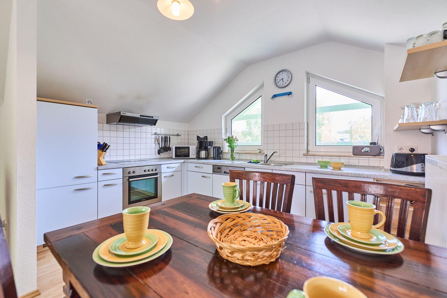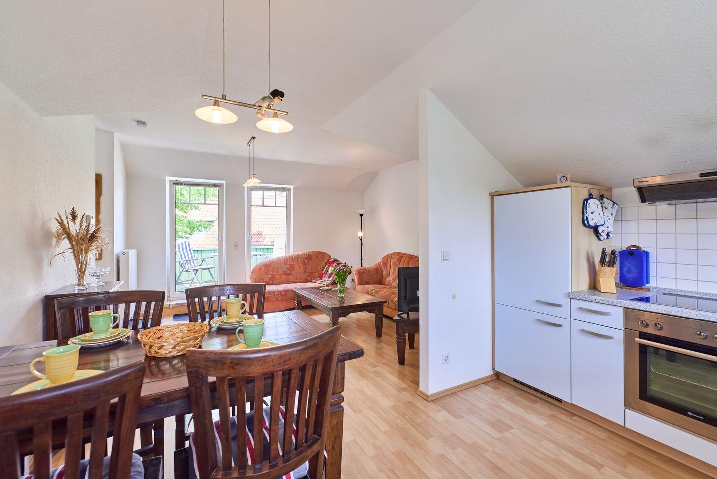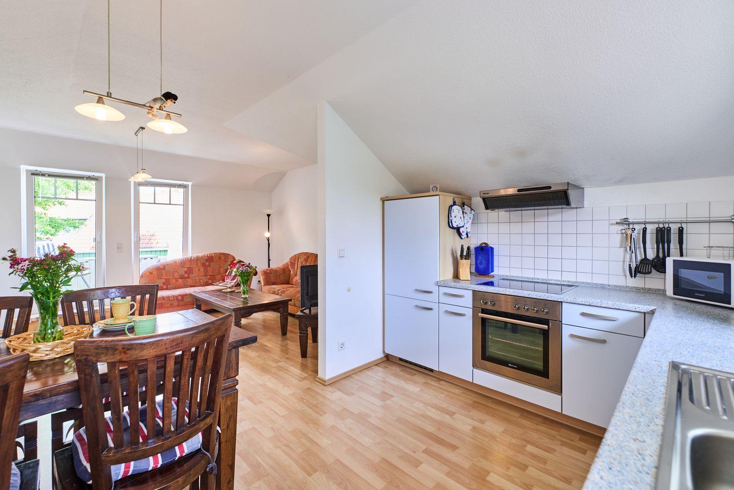 Die Ferienwohnung verfügt über zwei komfortable Schlafzimmer, die für einen erholsamen Schlaf sorgen. Der helle Laminatboden leitet die gemütliche und moderne Atmosphäre, die Ihnen hier begegnet. Angrenzend finden Sie ein offenes Wohnkonzept, das das Wohnzimmer, den Essbereich und die komplette Küche vereint. Hier können Sie gemeinsam kochen, essen und entspannen. Die vollständig ausgestattete Küche überzeugt mit modernen Geräten wie einem Ceranherd, Mikrowelle, Kühlschrank mit Gefrierfach und Geschirrspüler, sodass Sie sich wie zu Hause fühlen können. Natürlich sind auch Geschirr und Besteck vorhanden, damit Sie Ihre Mahlzeiten problemlos zubereiten können.