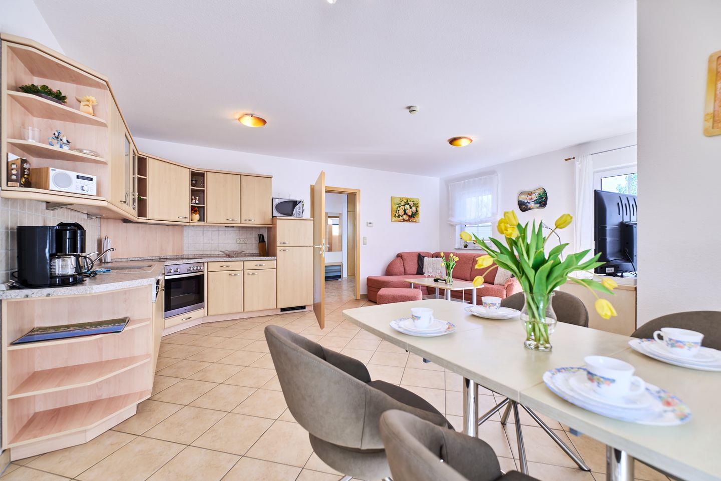 Die Ferienwohnung überzeugt mit einer hellen und modernen Einrichtung. Sie verfügt über zwei komfortable Schlafzimmer, die mit Fliesenboden ausgestattet sind und eine entspannende Schlafumgebung bieten. Ein offenes Wohnkonzept verbindet den Wohnbereich mit der voll ausgestatteten Küche, so dass das Kochen zum Vergnügen wird. Hier finden Sie alle modernen Annehmlichkeiten, darunter einen Backofen, einen Herd, eine Spülmaschine und viele Küchengeräte wie Kaffeemaschine und Wasserkocher. Der Essbereich ist perfekt, um gemeinsam zu speisen und unvergessliche Momente zu erleben.