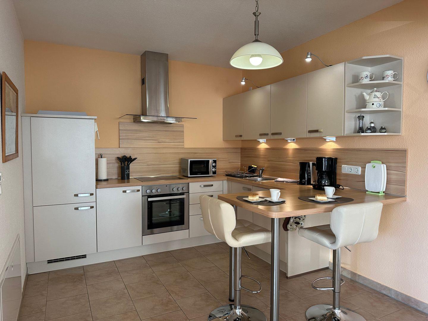 Die gemütliche Wohnung überzeugt durch ihr einladendes Ambiente und eine durchdachte Aufteilung. Das offene Wohnkonzept integriert die voll ausgestattete Küche perfekt in den Wohnbereich, wo Sie es sich auf dem komfortablen Sofa oder in der kuscheligen Sofaecke gemütlich machen können. Hier finden Sie auch einen Essbereich, an dem Sie gemeinsam Ihre Mahlzeiten genießen können. In der modernen Küche stehen Ihnen hochwertige Geräte zur Verfügung, darunter ein Cerankochfeld, Backofen, Mikrowelle, Geschirrspüler, Kühlschrank und zahlreiche Küchenutensilien, sodass die Zubereitung Ihrer Lieblingsgerichte ein Kinderspiel ist.