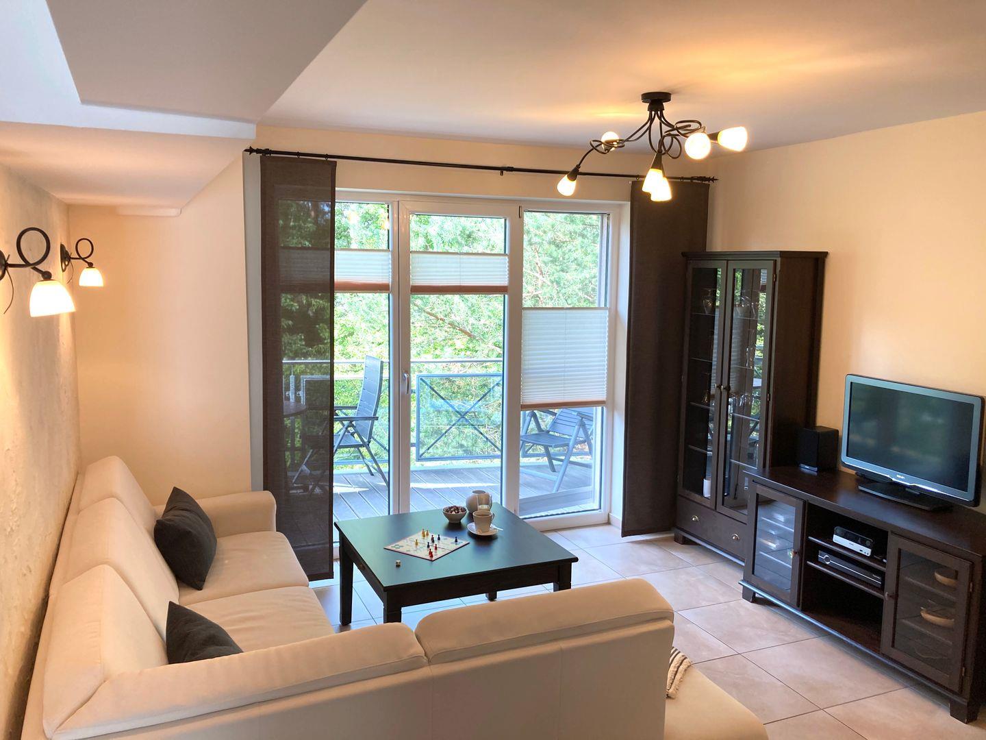 Ein weiteres Highlight der FeWo M11 ist der Balkon, auf dem Sie die frische Ostseeluft genießen können, während Sie in den Gartenmöbeln entspannen. Der Blick ins Grüne sorgt für eine beruhigende Atmosphäre und ist ideal, um das Frühstück im Freien zu genießen oder den Tag mit einem Glas Wein ausklingen zu lassen.