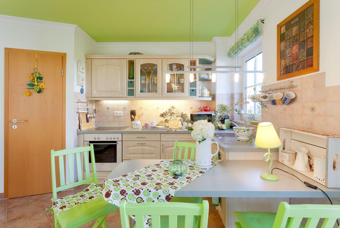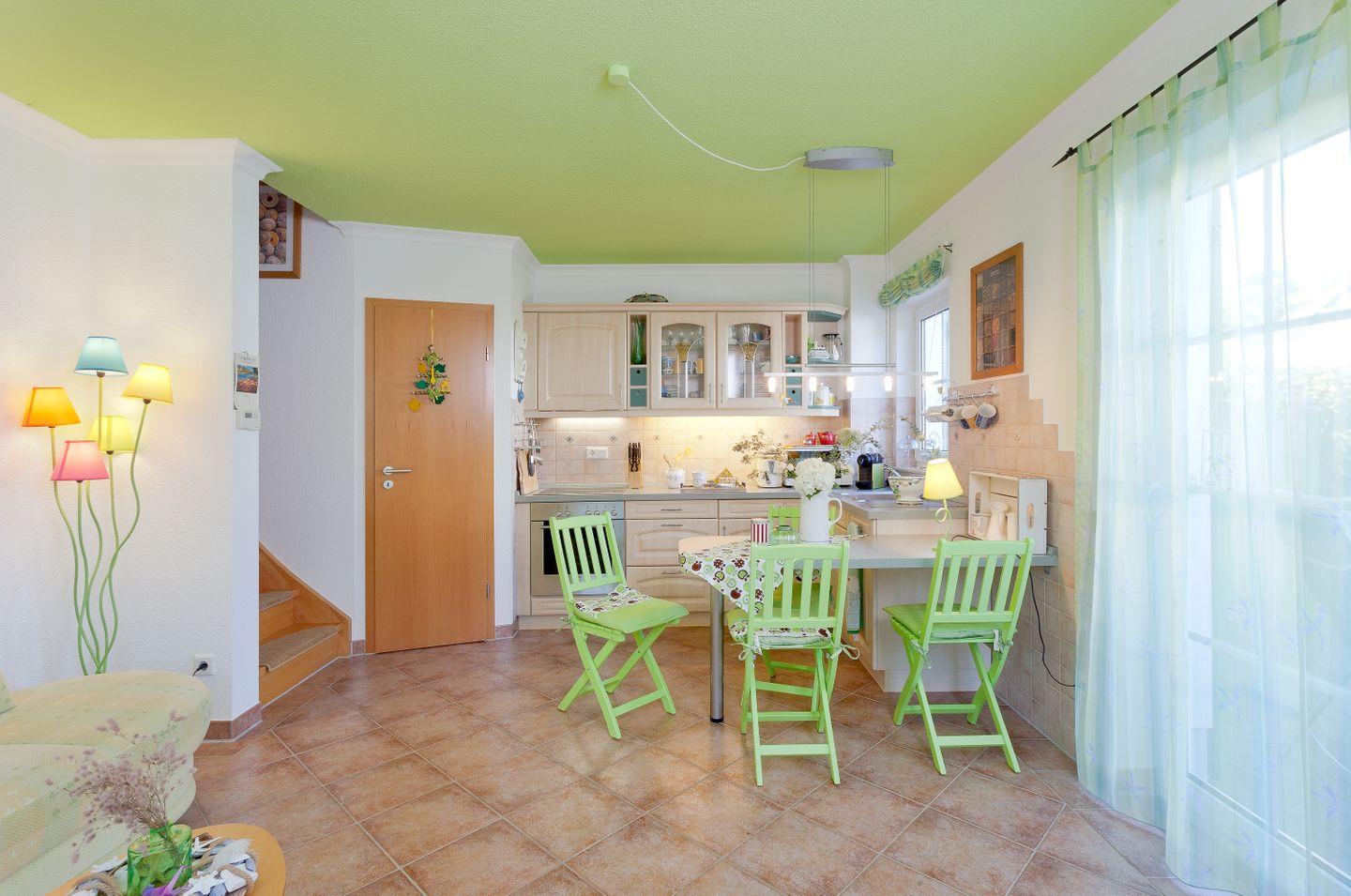 EG: Küche mit Esstisch, Kühlschrank mit Gefrierfach, Cerankochfeld, Kaffeemaschine