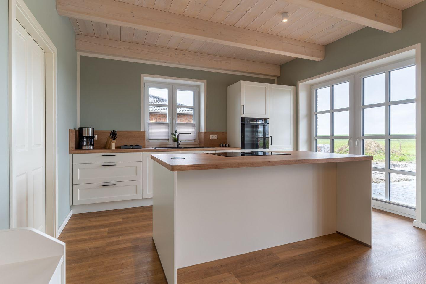 Der Wohn-Essbereich mit einer vollausgestatteten und hochwertigen Küche ist lichtdurchflutet und bietet direkten Zugang zum Garten. Auf der nach Westen ausgerichteten Gartenseite steht Ihnen eine möblierte Terrasse mit Strandkorb und Holzkohlegrill zur Verfügung. Außerdem befindet sich das erste von 3 Schlafzimmern und ein Gäste WC mit Dusche im Erdgeschoß. Über die Holztreppe gelangen Sie ins Obergeschoß wo sich die anderen beiden Schlafzimmer befinden. Von diesen Zimmern haben Sie Blick auf den Deich und die dahinter liegende Eider. Des weiteren befindet sich ein kleines Zimmer mit Couch und Schreibtisch, sowie ein großzügiges Badezimmer mit Wanne und ebenerdiger Dusche im Obergeschoß.