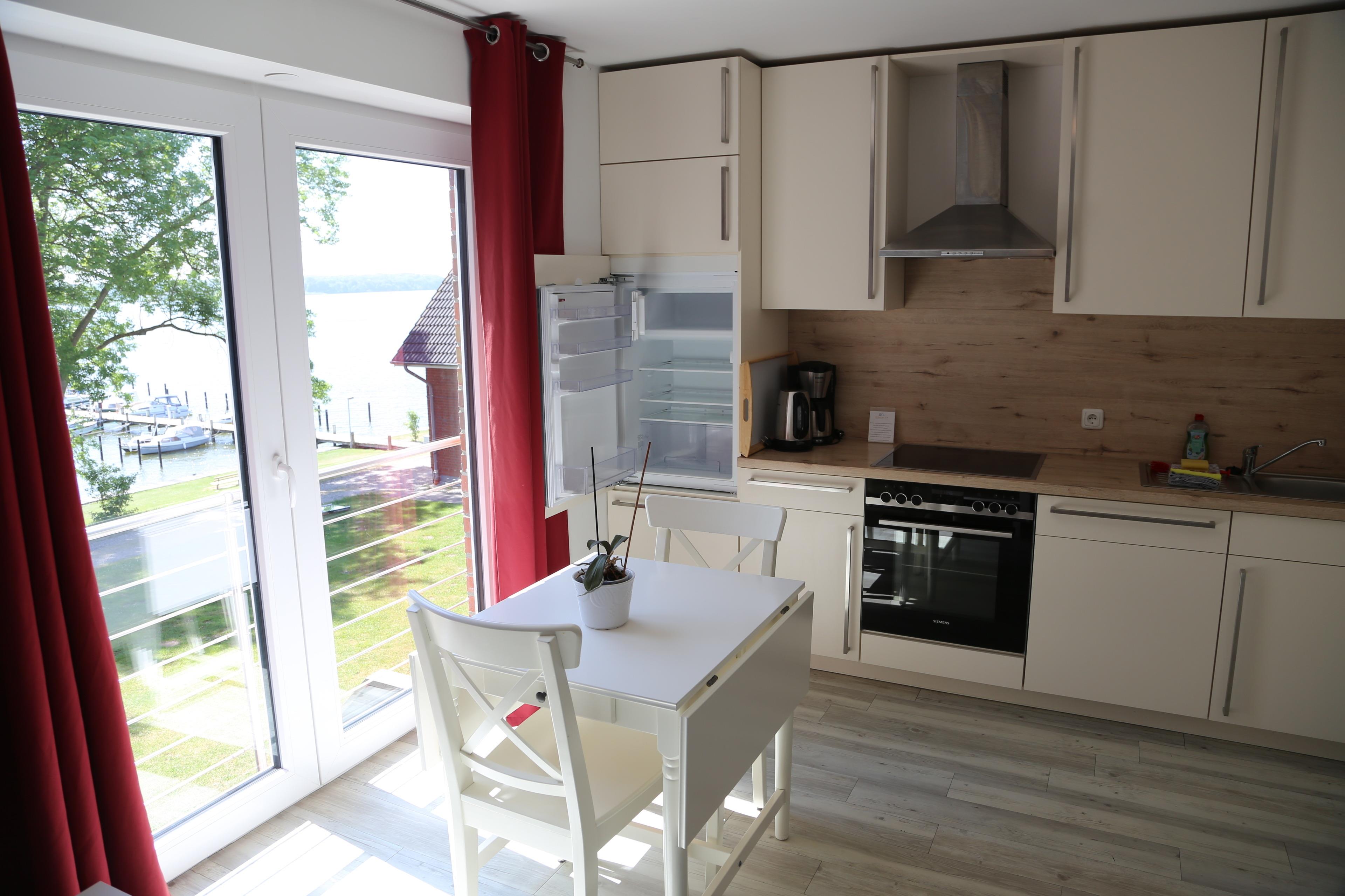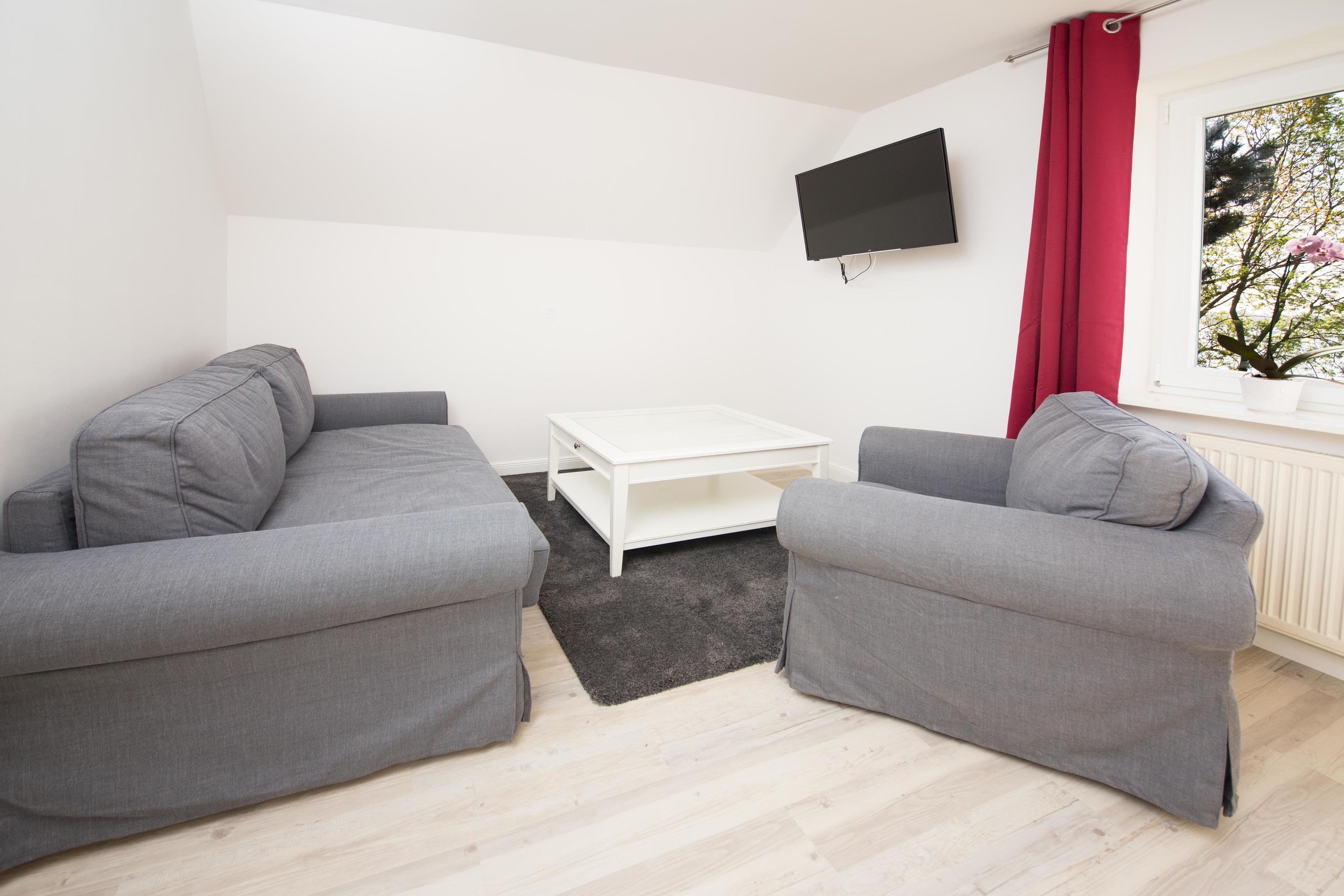 Wohnbereich: 1 Tisch mit 4 Stühlen, 1 Couchtisch, 1 Couch mit Schlaffunktion in der Größe eines französischen Bettes Küche und Haushaltsgegenstände: 1 Küchenzeile mit 4-Plattenherd, Spüle, Backofen, Dunstabzugshaube mit Umluft, Kühlschrank mit Gefrierfach, Kaffeemaschine, Wasserkocher, Toaster, Kochtöpfe und Bratpfanne, Besteck und Gläser für 4 Personen