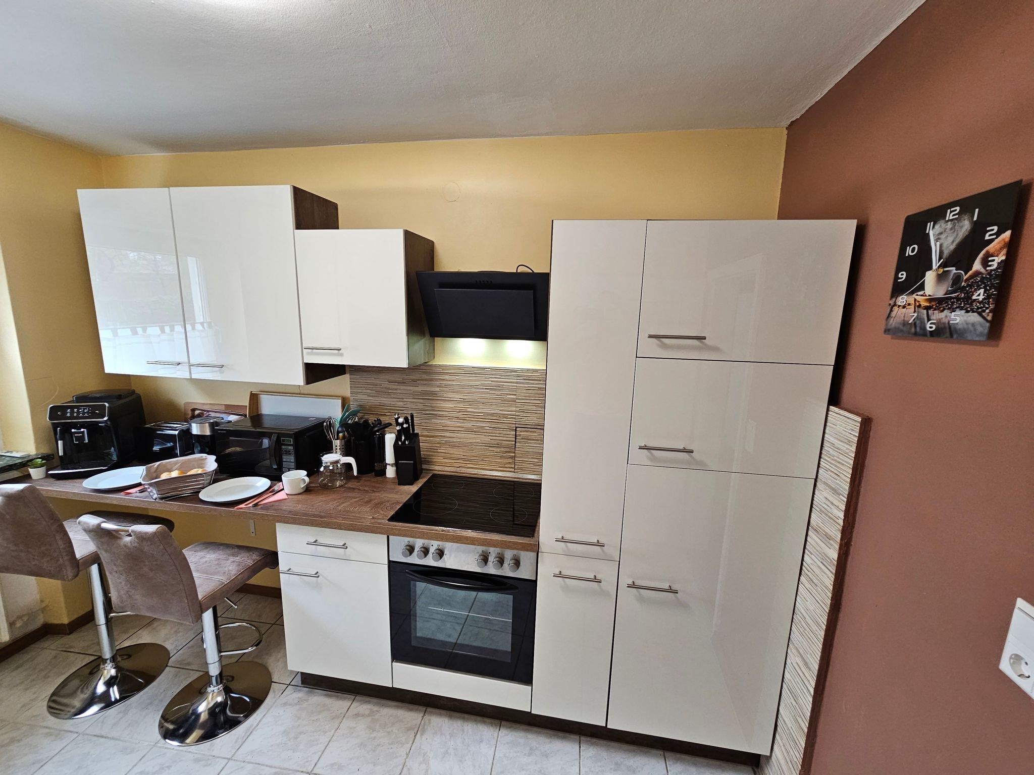 The kitchen is fully equipped. The highlight there is the fully automatic coffee machine that runs on whole beans (very tasty coffee!!). If you don't want to have breakfast in the dining room, there is a nice place with 2 stools in the kitchen.