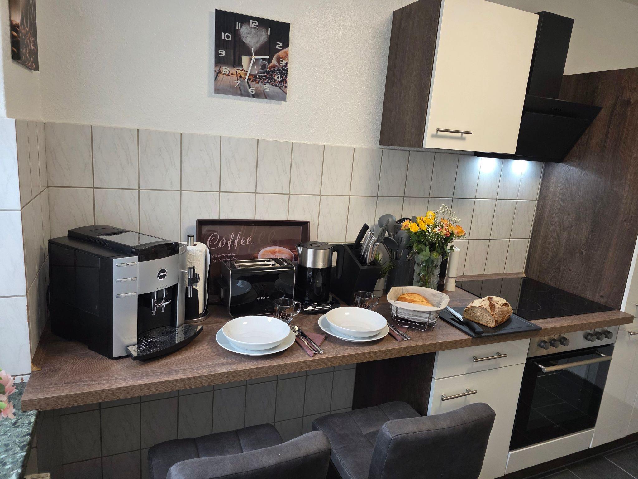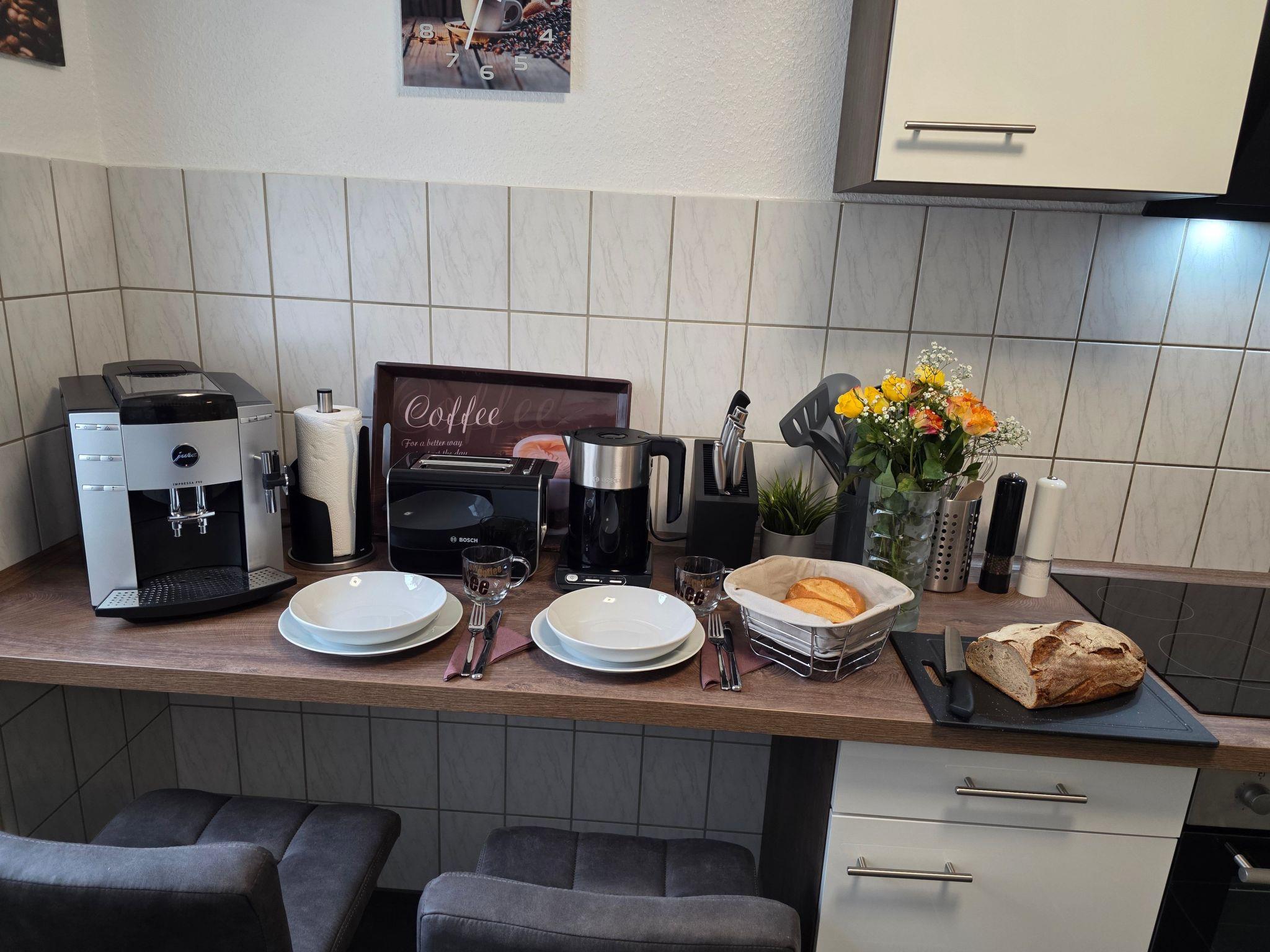 The kitchen is fully equipped. The highlight is the fully automatic coffee machine which is operated with whole beans (very tasty coffee!!). If you don't want to have breakfast in the dining room, there is a nice place with 2 stools in the kitchen.