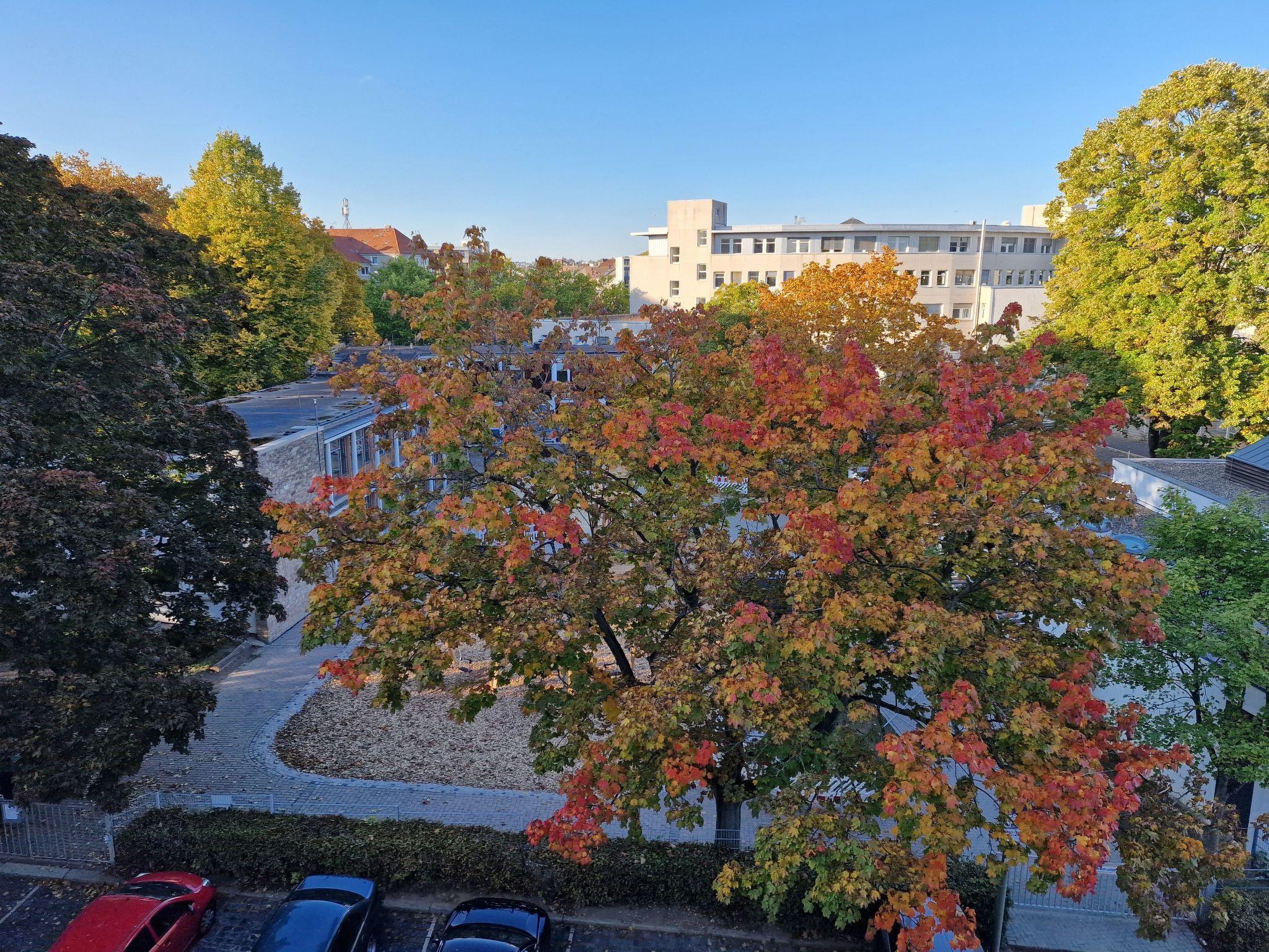 The view from the windows is to one side into the garden as well as to the gardens of the neighbouring houses. To the front, you have a view of the university on the street side. Despite the central location, it is relatively quiet at night, as there is no traffic noise in the attic.