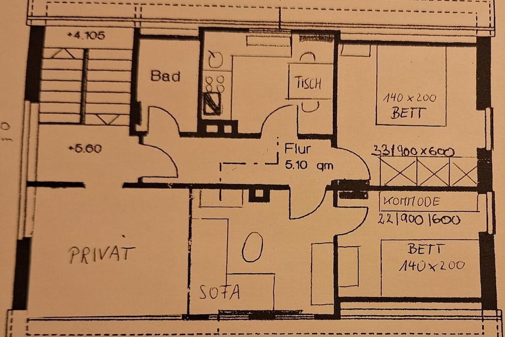 På anden sal venter en 50 kvm stor lejlighed med 3 værelser, 2 soveværelser, en stue og et fuldt udstyret køkken med spiseplads. Et lyst badeværelse med vindue og badekar med bruser fuldender ferieoplevelsen.