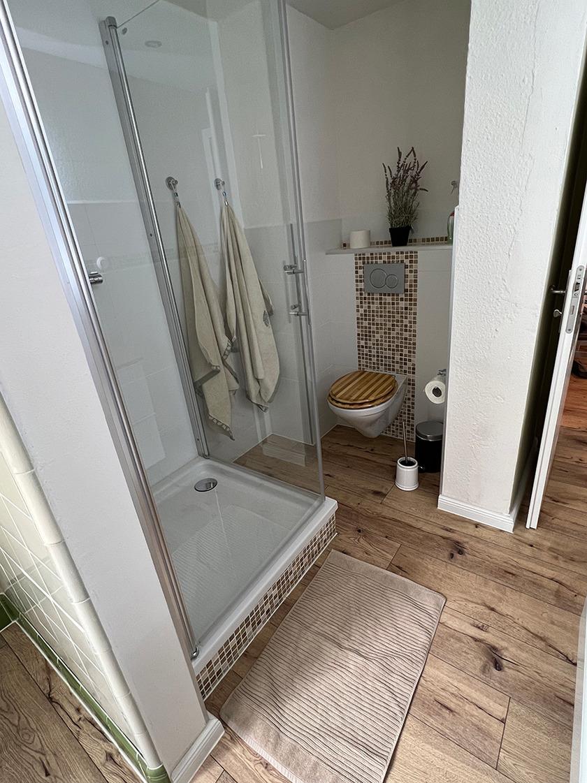 1 Bad mit WC, Urinal und Dusche (inkl. Hand- und Duschtücher, Seife). Der Bereich des Urinals ist mit alten Retro-Fliesen von Villeroy&Boch aus dem Jahr 1900 gefliest