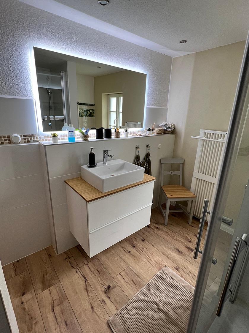 1 Wohnbereich (Sofa, Tisch, Kleiderschrank sowie Arbeitsplatz / Schreibtisch, TV mit TV-Magenta und zahlreichen anderen Programmdienstleistern, schnelles WLAN und die Möglichkeit eines LAN-Anschlusses). Der Wohnbereich verfügt - ebenso wie der Schlafbereich - über warme Kirschholzdielen.