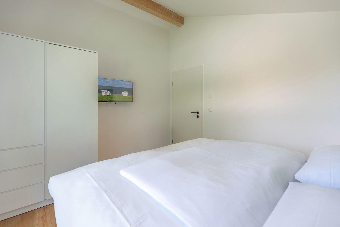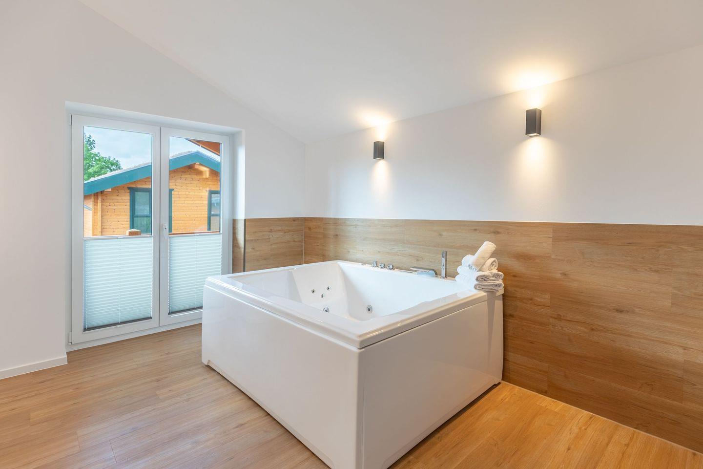 Ein modernes Badezimmer mit bodengleicher Dusche, WC sowie Sauna und einem Whirlpool sorgen für besonderen Komfort. Ein echtes Highlight ist der angrenzende Balkon mit wunderbarer Aussicht über das Katinger Watt!