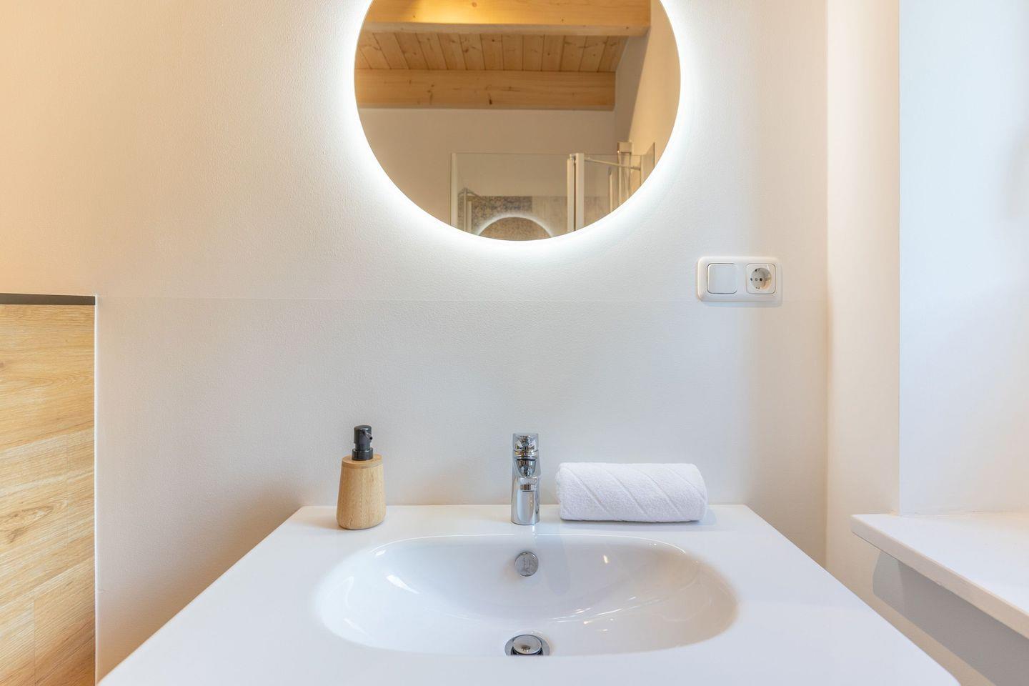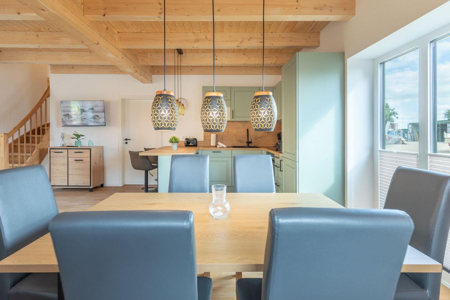 Die offene Küche ist voll ausgestattet mit Induktionskochfeld, Backofen, Mikrowelle, Spülmaschine, Senseo-Kaffeemaschine und Kühlschrank mit Gefrierfach – perfekt für gemeinsame Kochabende. Im gemütlichen Wohnbereich laden eine Sofaecke und ein SMART-Fernseher zum Verweilen ein. Kostenloses, schnelles WLAN hält Sie jederzeit online. Der angrenzende Essbereich bietet ausreichend Platz für alle Gäste.
