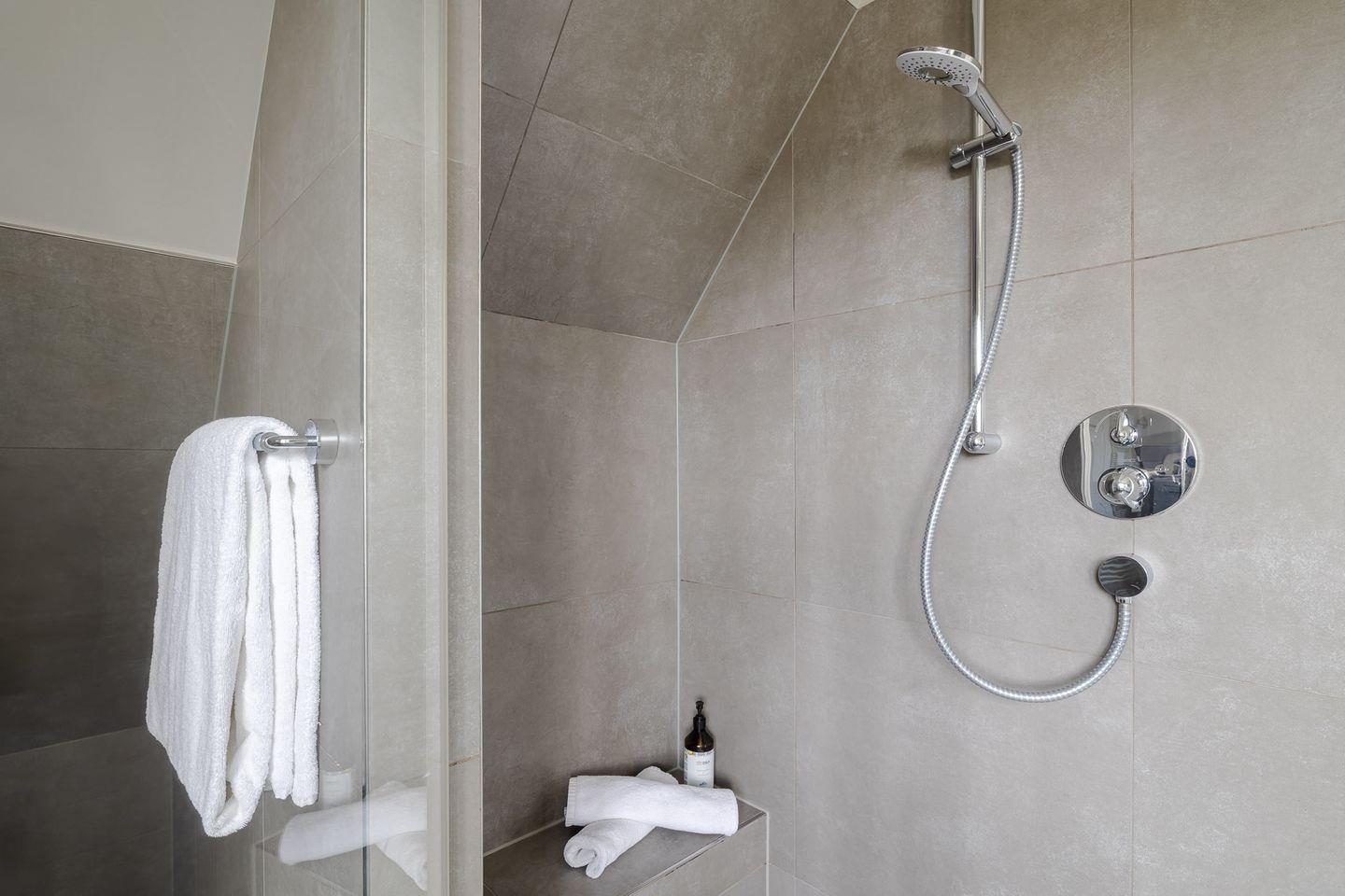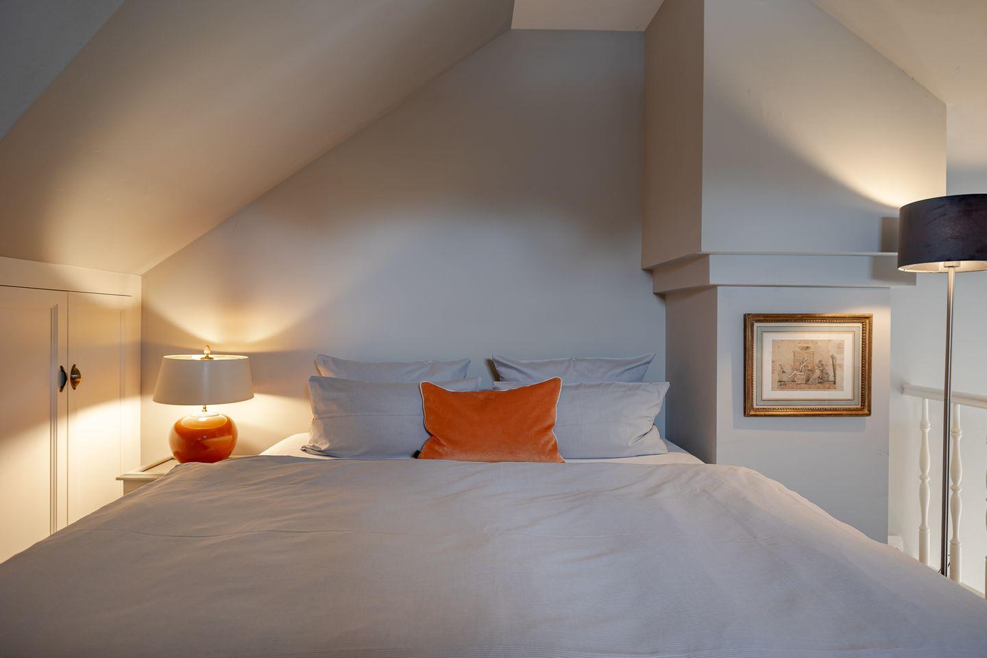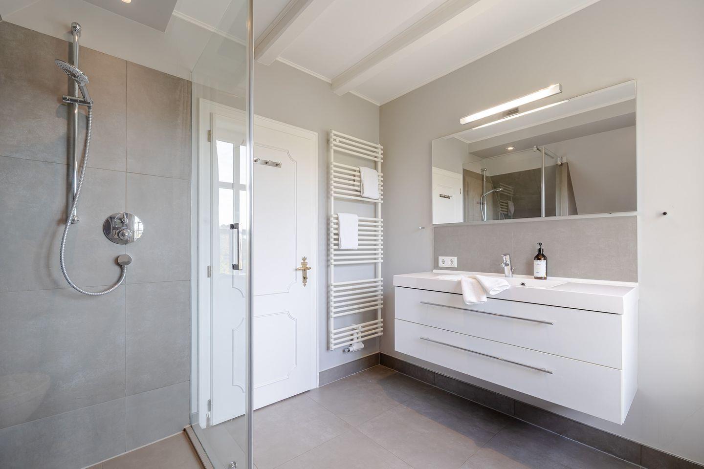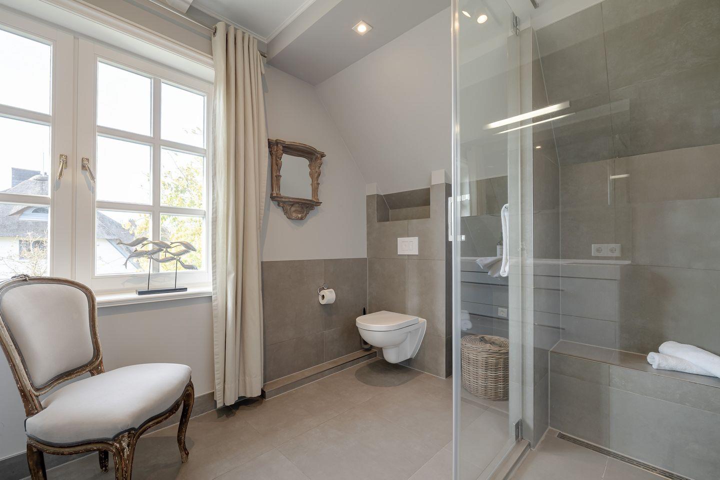 Im komfortablen Schlafzimmer mit hochwertigem Boxspringbett finden Sie erholsame Nachtruhe, während das stilvolle Badezimmer mit bodengleicher Dusche für entspannende Wohlfühlmomente sorgt.