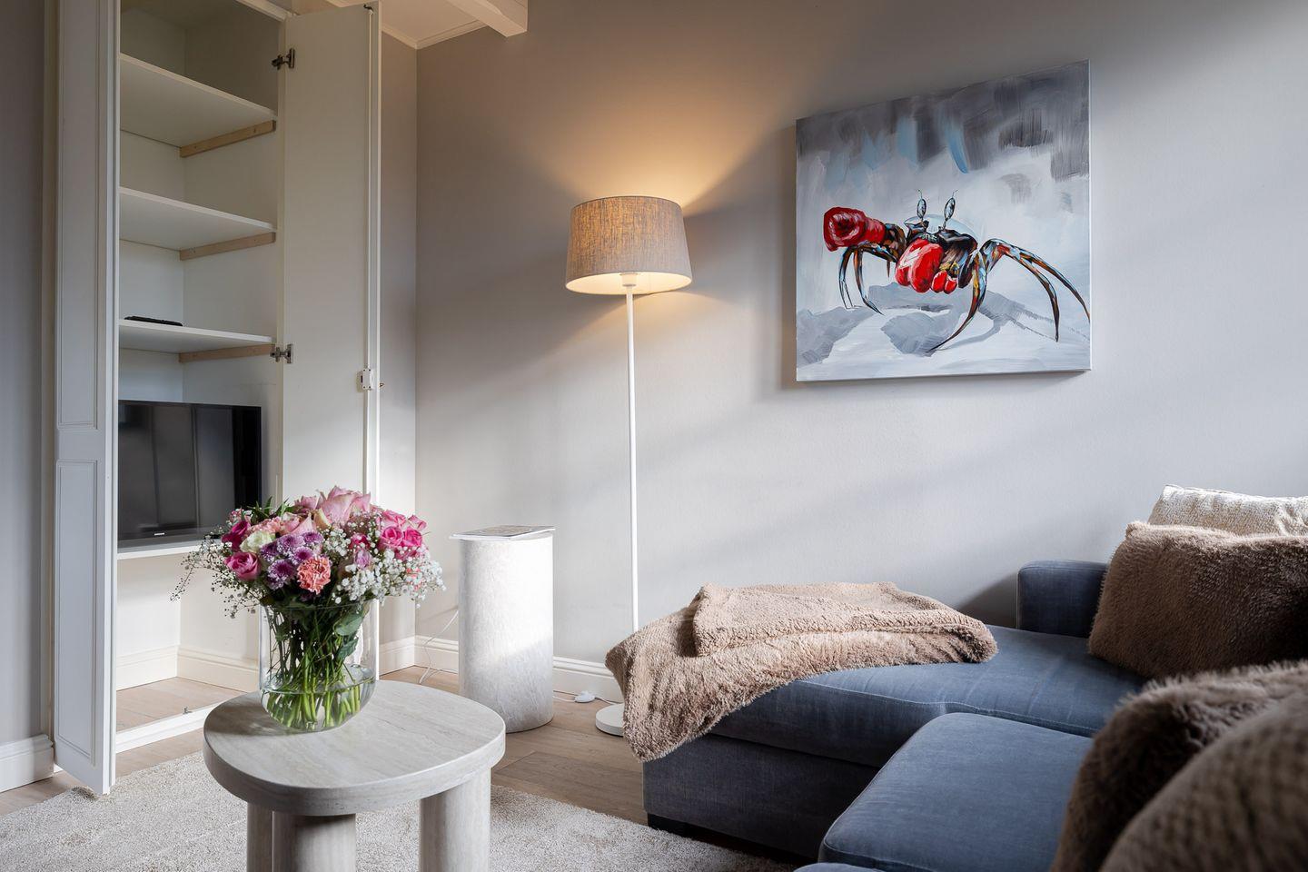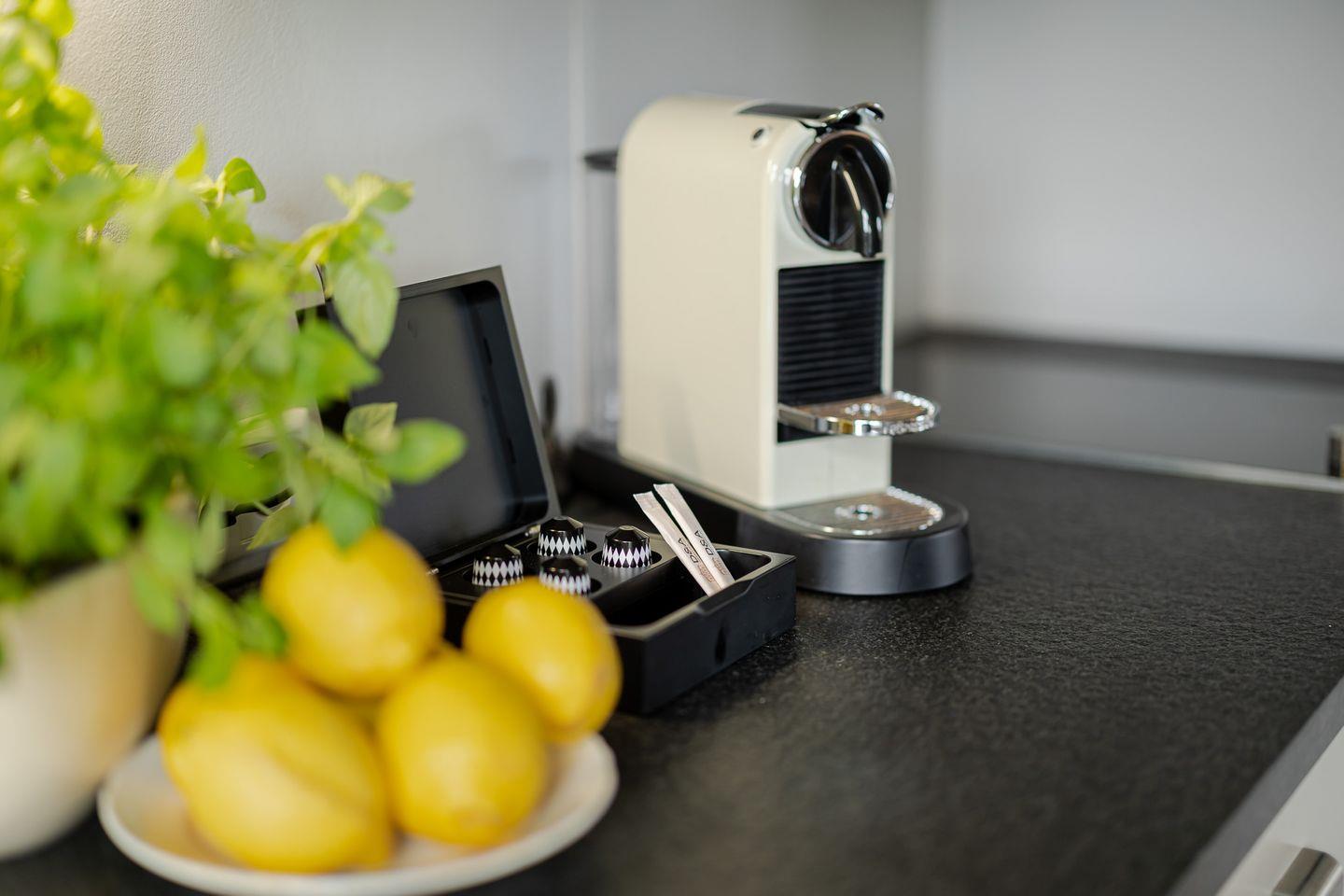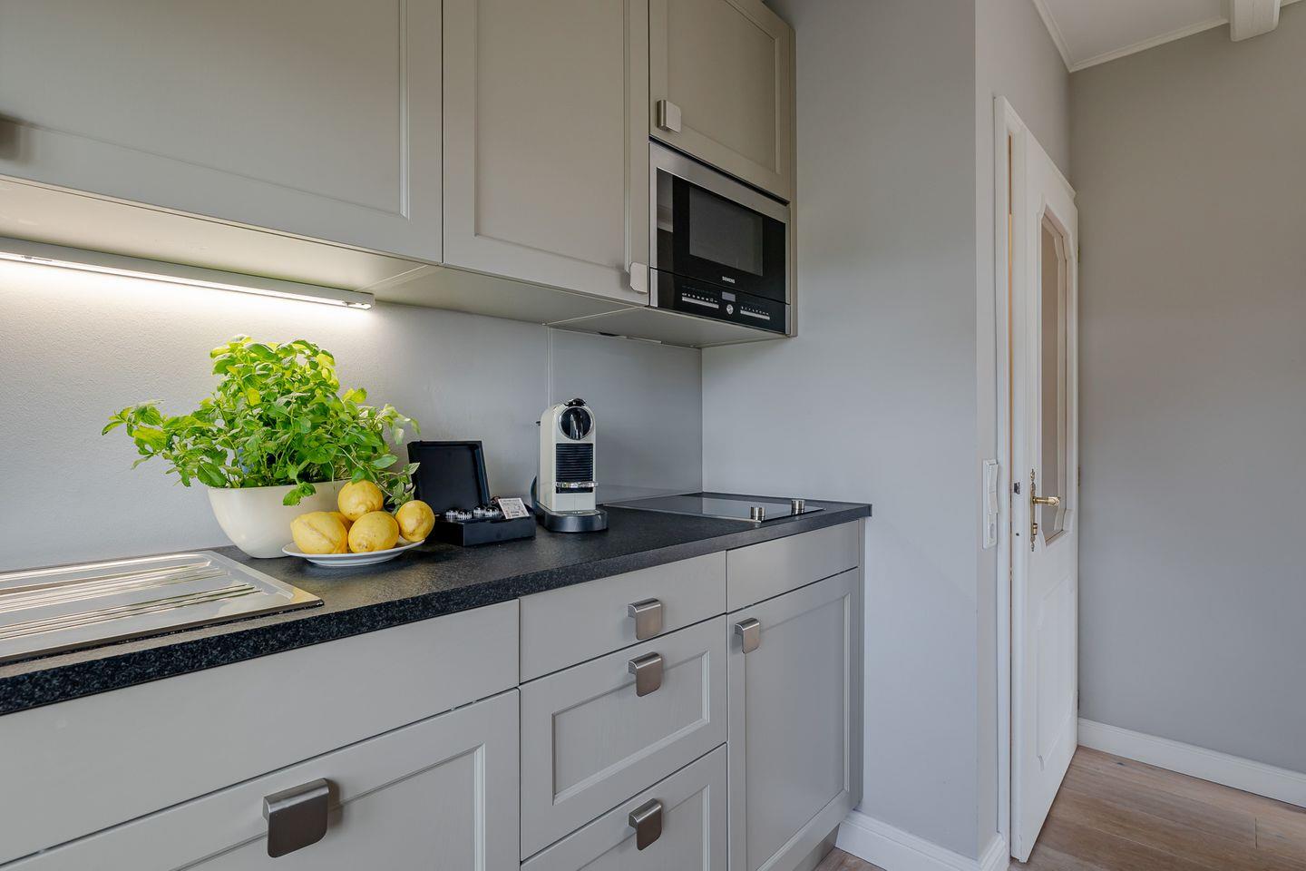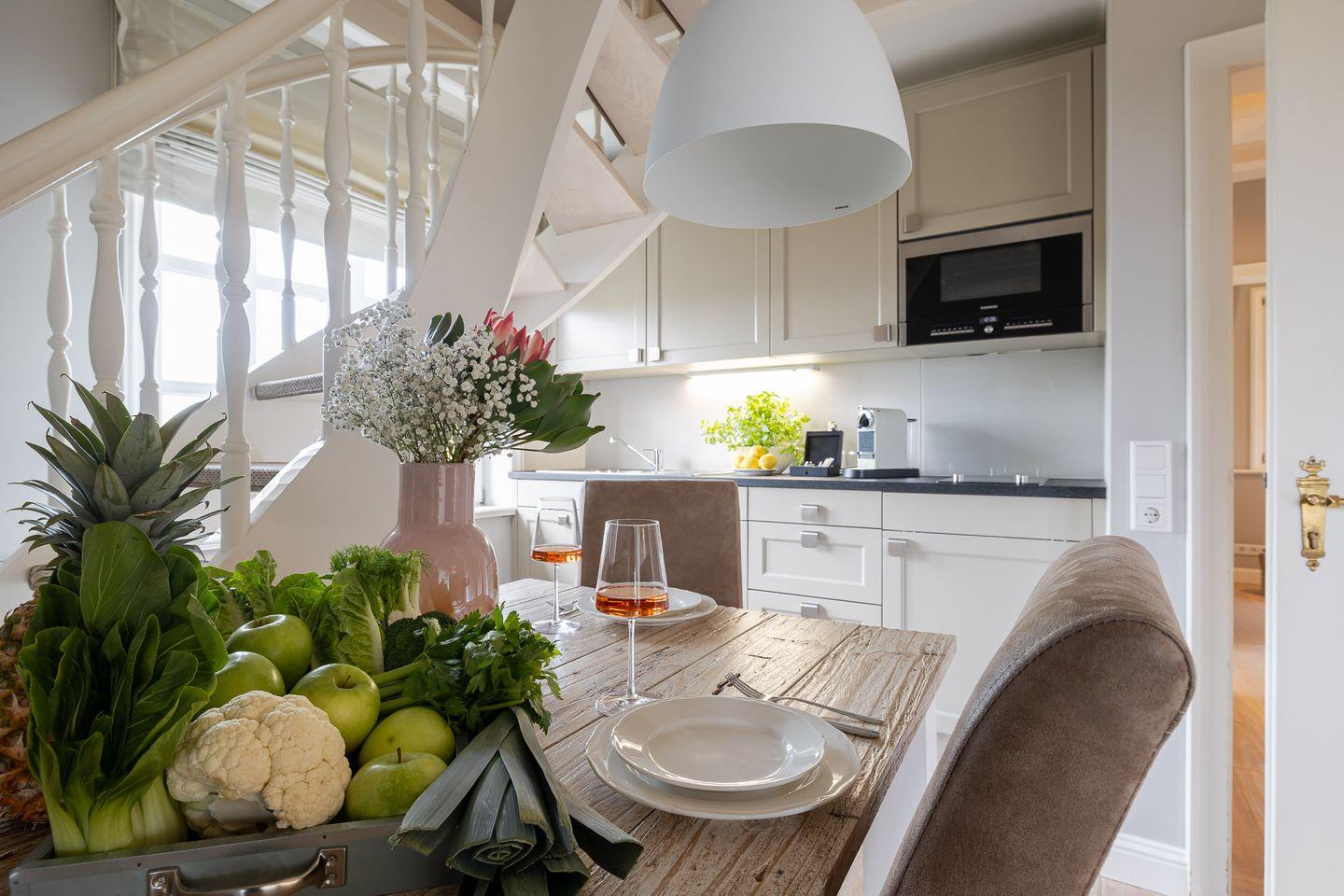 Die Wohnung beeindruckt mit ihrem eleganten und gleichzeitig verspielten Ambiente. Der großzügige Wohnbereich mit ausziehbarem Schlafsofa und gemütlichem Essplatz bildet das Herzstück der Wohnung. In der hellen, voll ausgestatteten Küche inklusive Filterkaffeemaschine macht das Kochen Spaß und wird zum gemeinsamen Genuss.