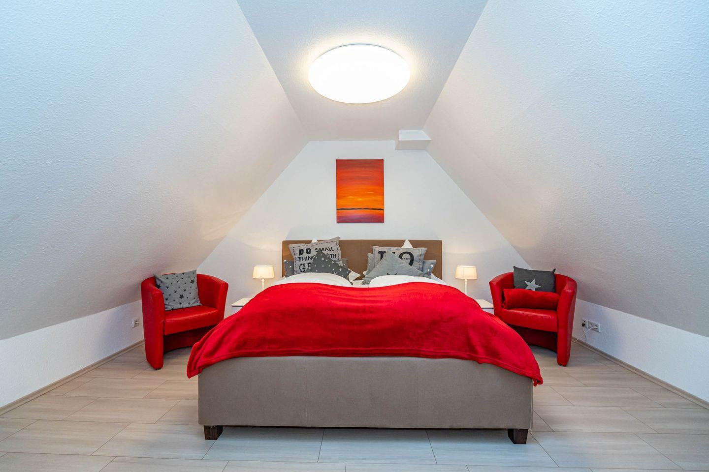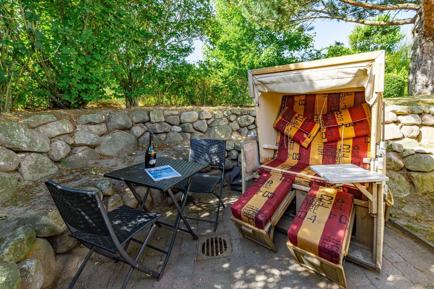 Die Ferienwohnung ist hell und freundlich eingerichtet und befindet sich im 1 OG. Zentraler Raum ist das Wohnzimmer mit offener Küche. Der Wohnbereich mit Sofa und Flatscreen bietet viel Raum und lädt Sie zu gemütlichen Abenden ein. Die vollausgestattete Küche offeriert alles, was Sie als Urlauber zum Kochen brauchen: Herd mit Ceranfeld und Backofen, Mikrowelle, Spülmaschine, Waschtrockner, Kaffeemaschine, Wasserkocher und Toaster. Im Schlafzimmer befindet sich neben dem Schrank mit genügend Stauraum ein hochwertiges Boxspringbett (180x200 cm) sowie ein Flatscreen. Ein Wannenbad mit Duschwand befindet sich ebenfalls auf dieser Etage. Über eine Treppe zum Obergeschoss erreichen Sie ein weiteres Schlafzimmer. Dort erwarten Sie ein weiteres komfortables Boxspringbett (180x200 cm) und ein ebenfalls ein Flatscreen. Unseren Gästen steht ein Waschtrockner in der Wohnung kostenlos zur Verfügung. Eine gemütliche Sonnenkuhle im Gemeinschaftsgarten mit Ihrem eigenen Strandkorb lädt zum Verweilen ein. Hier können Sie in der windgeschützten Sonnenkuhle Ihre Urlaubszeit genießen. Direkt neben dem Haus ist ein PKW Stellplatz für Sie reserviert. Fahrradständer befinden sich auf der Anlage. Ihren kleinen Hund können Sie gerne nach Anmeldung mitbringen (10,- € pro Tier/Tag). Bitte beachten Sie, dass diese Ferienwohnung eine Nichtraucherwohnung ist.