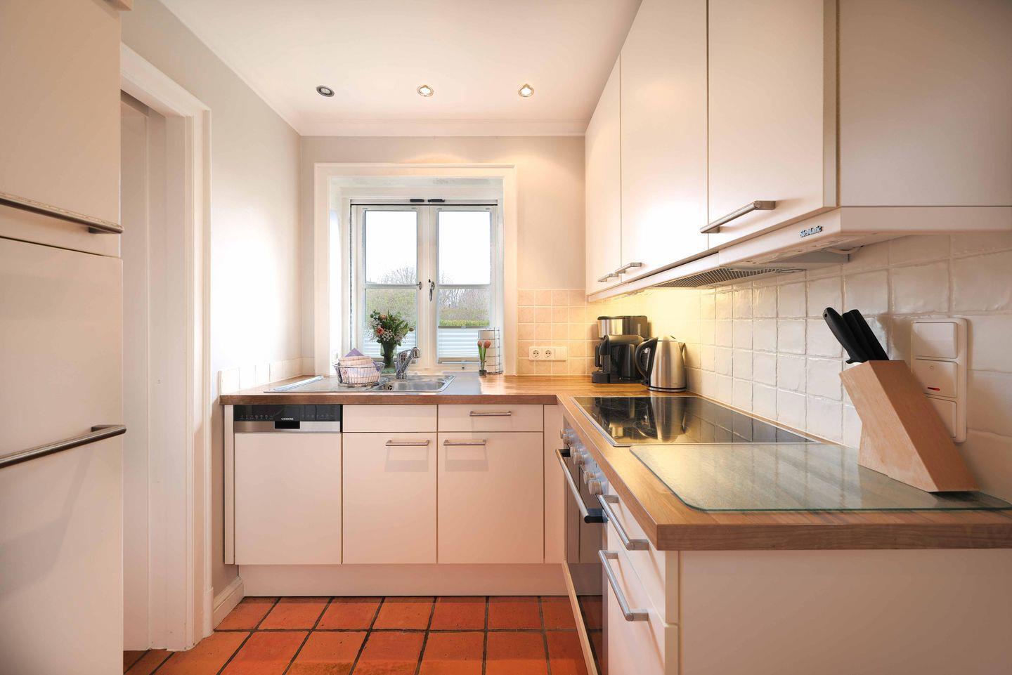 Detail der Unterkunft: Die ins Freie führende, geteilte "Klönschnack-Tür". Trotz dieses historischen Details ist die Küche mit modernstem Standard versehen. Ein Backofen, das Ceranfeld, ein großer Kühlschrank und der Geschirrspüler sorgen für alle Annehmlichkeiten beim Kochen. Die Ausstattung mit zwei Kaffeemaschinen (Kapsel- sowie Filtersystem), Mikrowelle, Toaster, Eierkocher und weiteren Küchengeräten rundet die Küche ab.