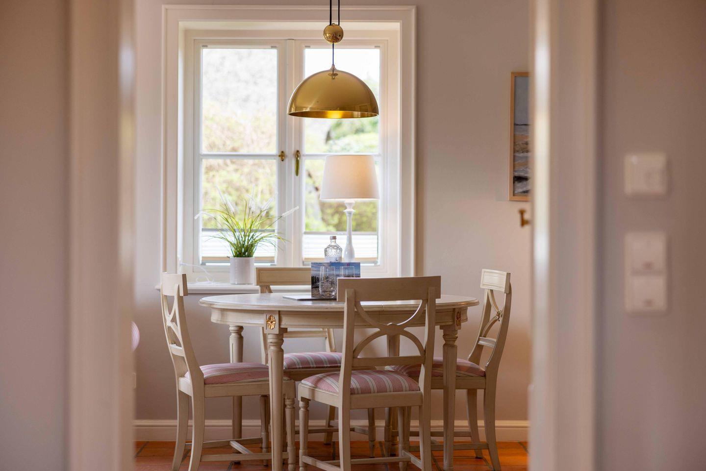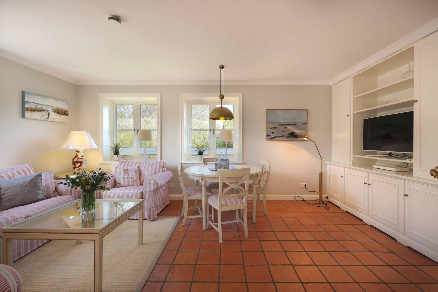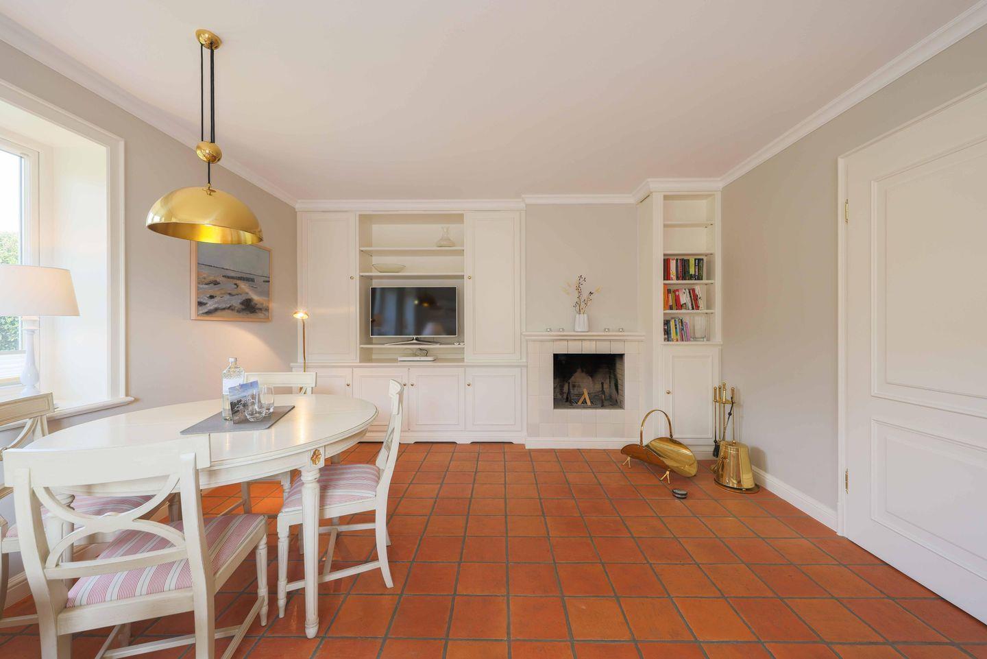 Helle Farben, viel Licht und hochwertige Tischlereieinbauten sorgen im Wohnzimmer für Gemütlichkeit. Ein Kamin und die Fußbodenheizung unterstreichen diese zusätzlich. Neben der bequemen Sitzgruppe ist der Wohnbereich mit einer Essecke möbliert. Es gibt einen SmartTV mit Bluray-Player und eine Dockingstation für iPhone, iPad und iPod, so dass auch modernen Ausstattungsansprüchen genüge getan wird.
